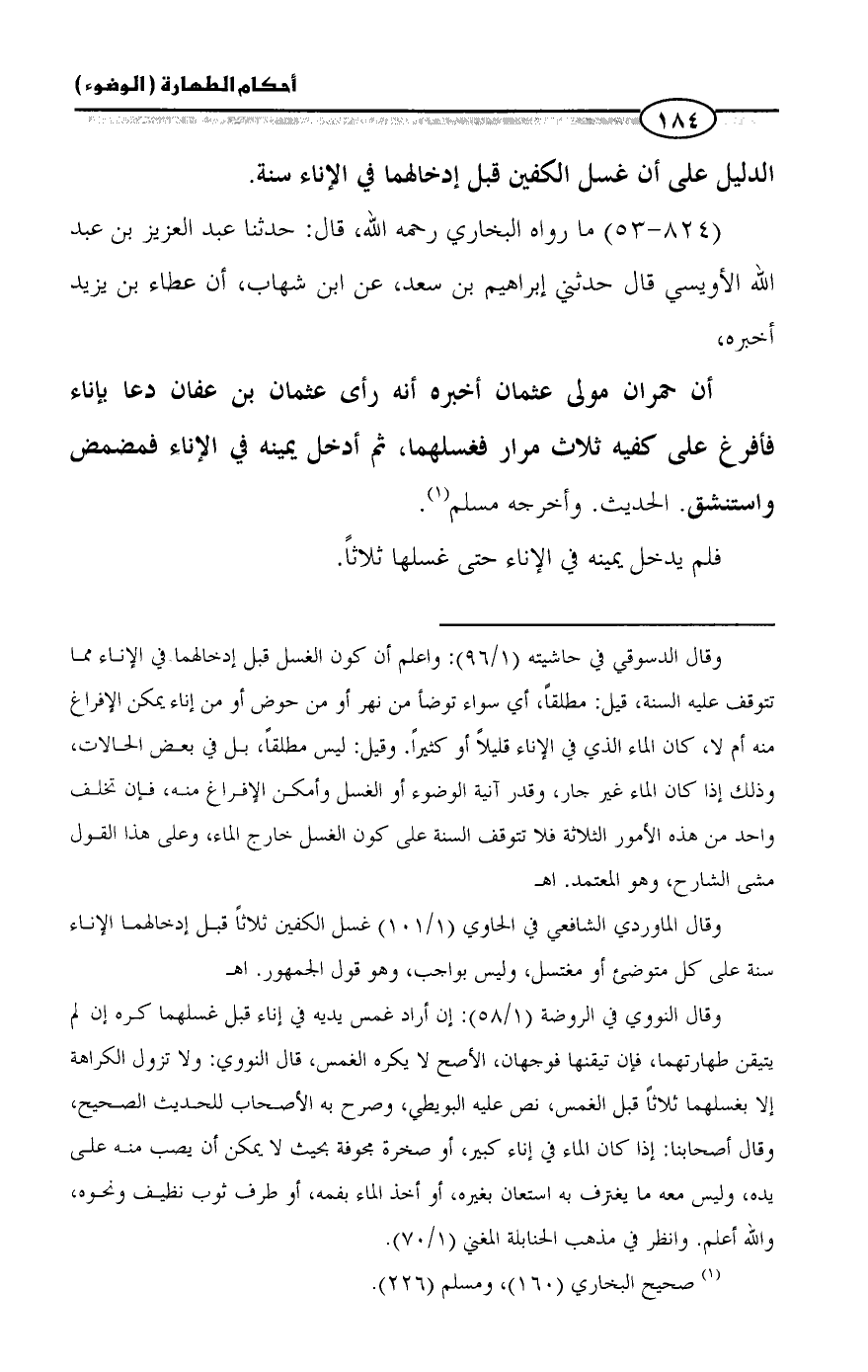 أن حمران مولى عثمان أخبره أنه رأى عثمان بن عفان دعا بإناء فأفرغ على كفيه ثلاث مرار فغسلهما، ثم أدخل يمينه في الإناء فمضمض واستنشق. الحديث. وأخرجه مسلم (¬١).