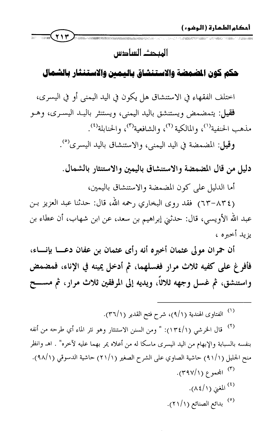 (¬٢) قال الخرشي (١/ ١٣٤): " ومن السنن الاستنثار وهو نثر الماء أي طرحه من أنفه بنفسه بالسبابة والإبهام من اليد اليسرى ماسكا له من أعلاه يمر بهما عليه لآخره". اهـ وانظر منح الجليل (١/ ٩١) حاشية الصاوي على الشرح الصغير (١/ ٢١) حاشية الدسوقي (١/ ٩٨).
