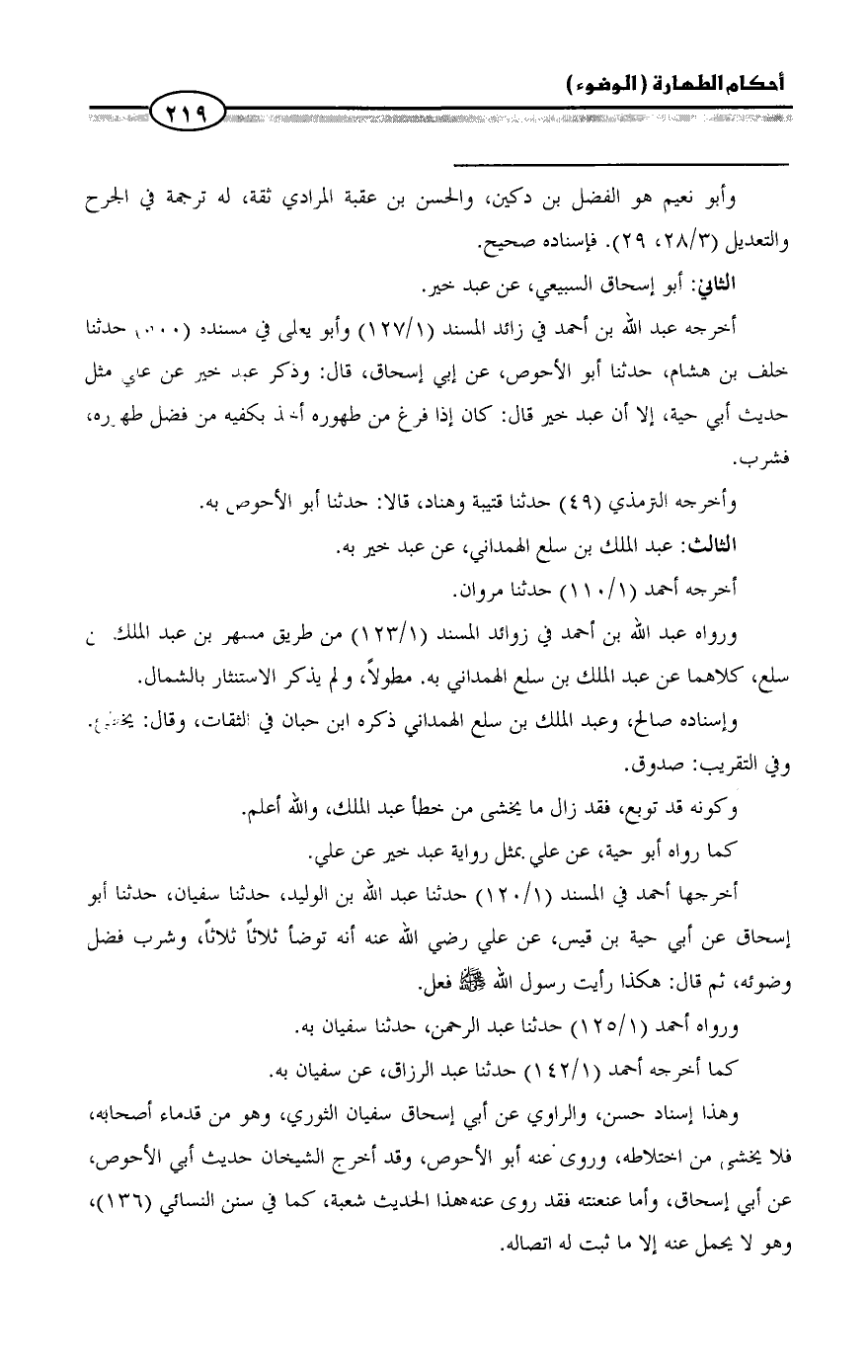 وهذا إسناد حسن، والراوي عن أبي إسحاق سفيان الثوري، وهو من قدماء أصحابه، فلا يخشى من اختلاطه، وروى عنه أبو الأحوص، وقد أخرج الشيخان حديث أبي الأحوص، عن أبي إسحاق، وأما عنعنته فقد روى عنه هذا الحديث شعبة، كما في سنن النسائي (١٣٦)، وهو لا يحمل عنه إلا ما ثبت له اتصاله. =