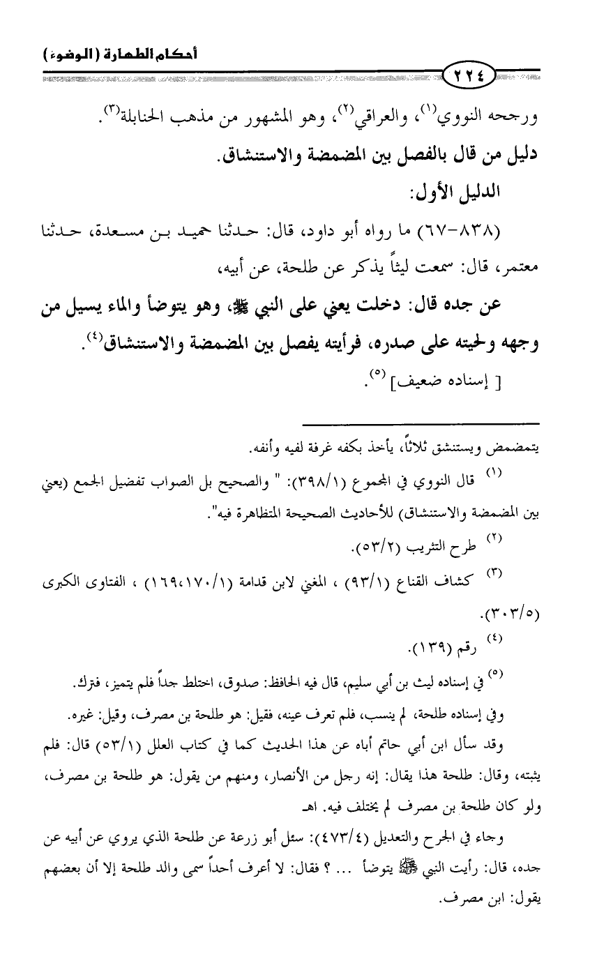 (٨٣٨ - ٦٧) ما رواه أبو داود، قال: حدثنا حميد بن مسعدة، حدثنا معتمر، قال: سمعت ليثاً يذكر عن طلحة، عن أبيه،