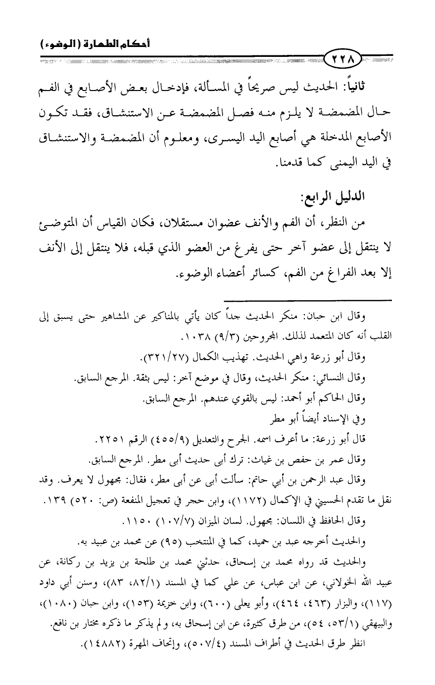 ثانياً: الحديث ليس صريحاً في المسألة، فإدخال بعض الأصابع في الفم حال المضمضة لا يلزم منه فصل المضمضة عن الاستنشاق، فقد تكون الأصابع المدخلة هي أصابع اليد اليسرى، ومعلوم أن المضمضة والاستنشاق في اليد اليمنى كما قدمنا.
