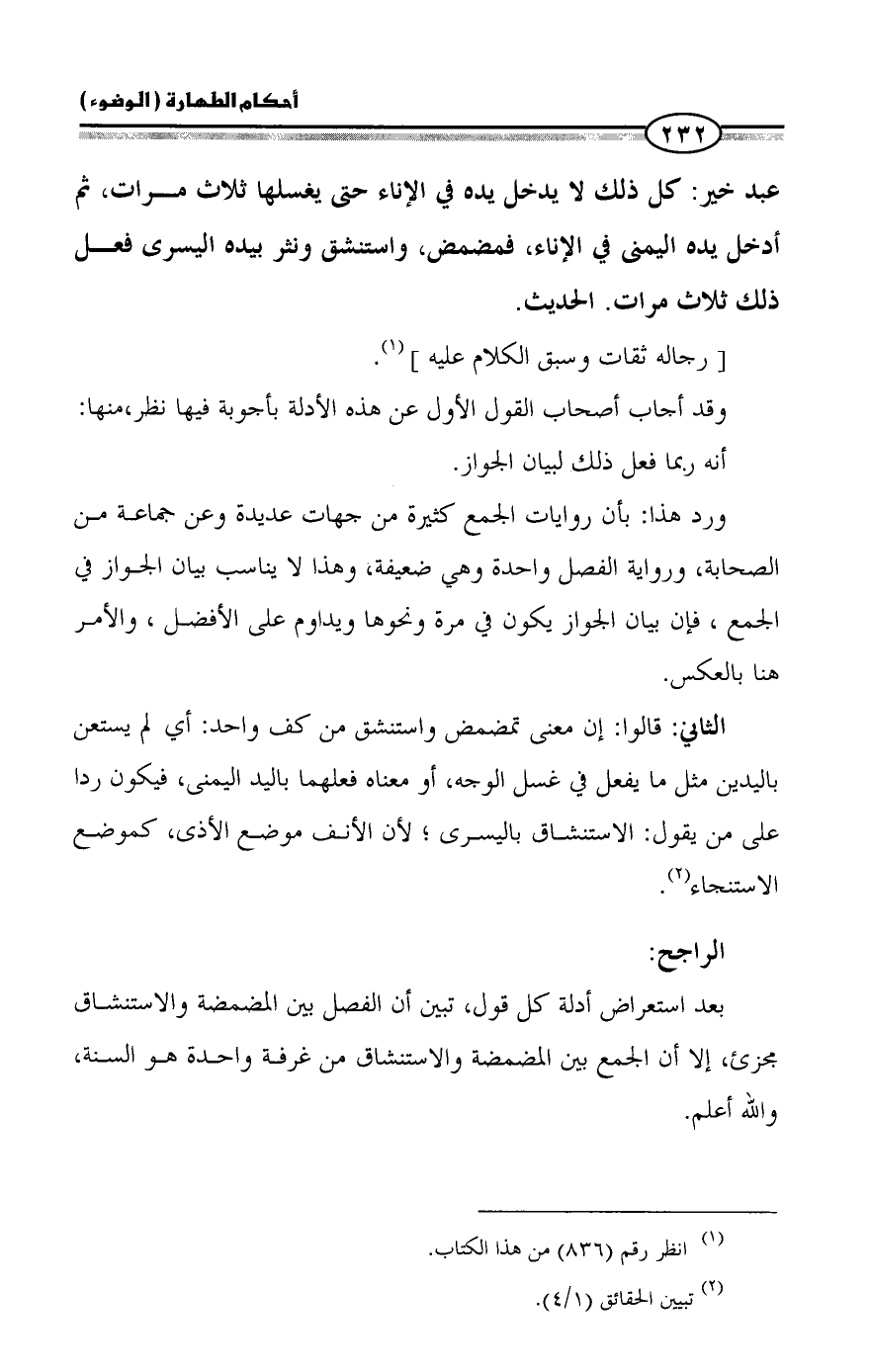 عبد خير: كل ذلك لا يدخل يده في الإناء حتى يغسلها ثلاث مرات، ثم أدخل يده اليمنى في الإناء، فمضمض، واستنشق ونثر بيده اليسرى فعل ذلك ثلاث مرات. الحديث.
