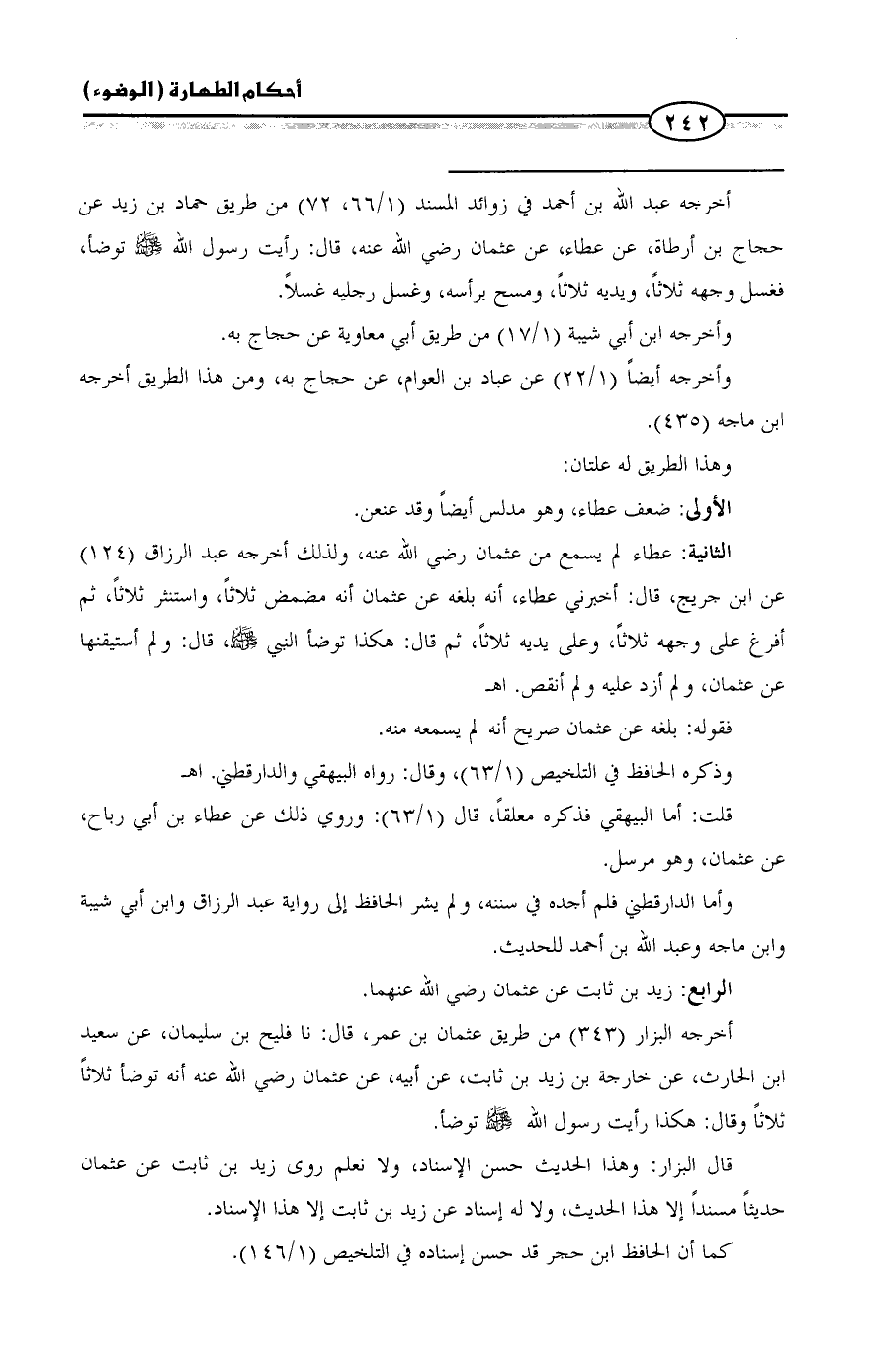 الثانية: عطاء لم يسمع من عثمان رضي الله عنه، ولذلك أخرجه عبد الرزاق (١٢٤) عن ابن جريج، قال: أخبرني عطاء، أنه بلغه عن عثمان أنه مضمض ثلاثاً، واستنثر ثلاثاً، ثم أفرغ على وجهه ثلاثاً، وعلى يديه ثلاثاً، ثم قال: هكذا توضأ النبي - صلى الله عليه وسلم -، قال: ولم أستيقنها عن عثمان، ولم أزد عليه ولم أنقص. اهـ