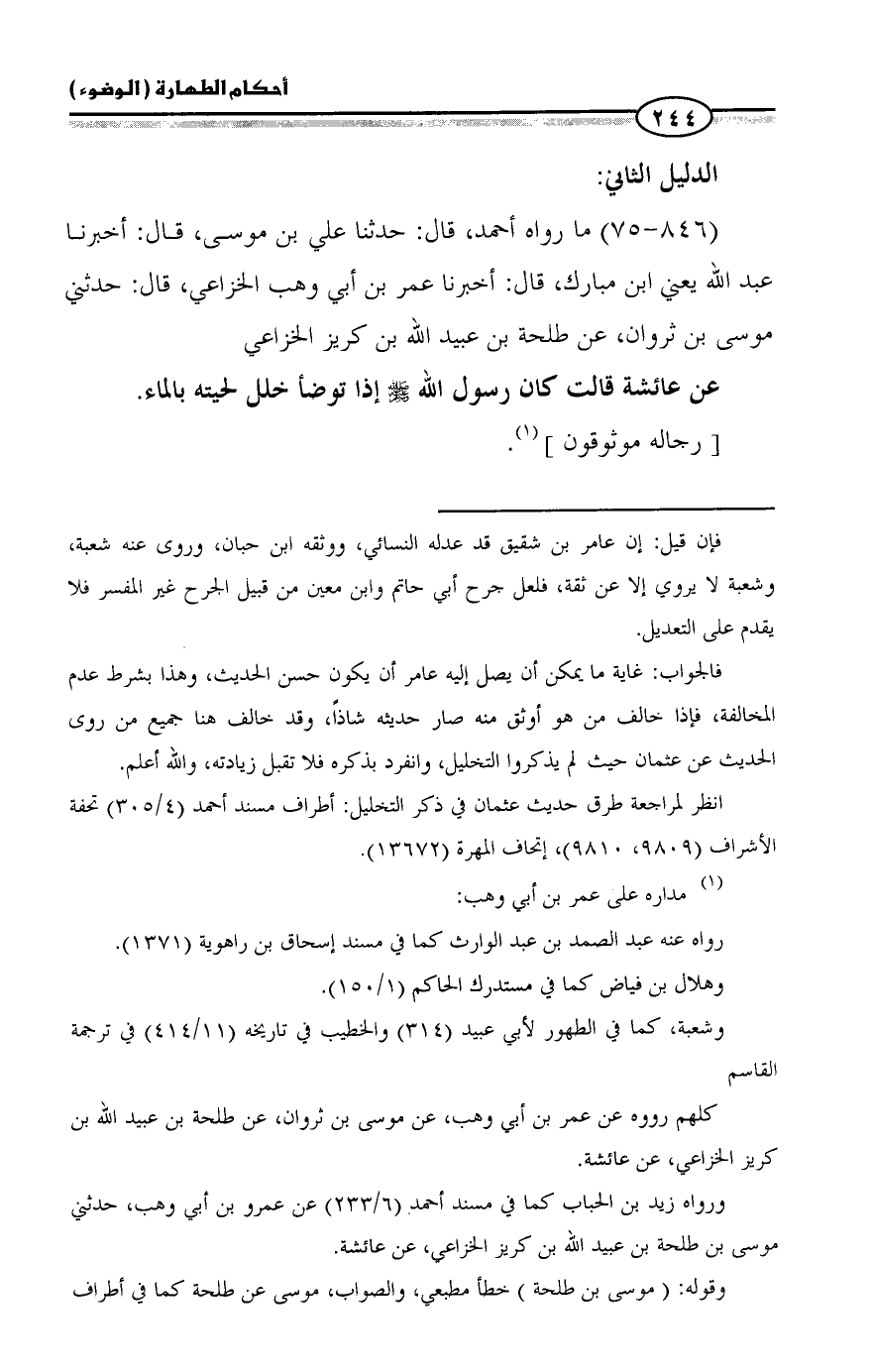 (٨٤٦ - ٧٥) ما رواه أحمد، قال: حدثنا علي بن موسى، قال: أخبرنا عبد الله يعني ابن مبارك، قال: أخبرنا عمر بن أبي وهب الخزاعي، قال: حدثني موسى بن ثروان، عن طلحة بن عبيد الله بن كريز الخزاعي
