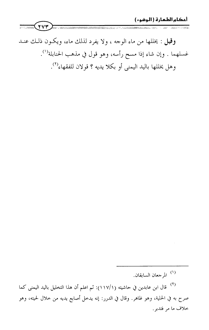 (¬٢) قال ابن عابدين في حاشيته (١/ ١١٧): ثم اعلم أن هذا التخليل باليد اليمنى كما صرح به في الحلية, وهو ظاهر. وقال في الدرر: إنه يدخل أصابع يديه من خلال لحيته, وهو خلاف ما مر فتدبر.