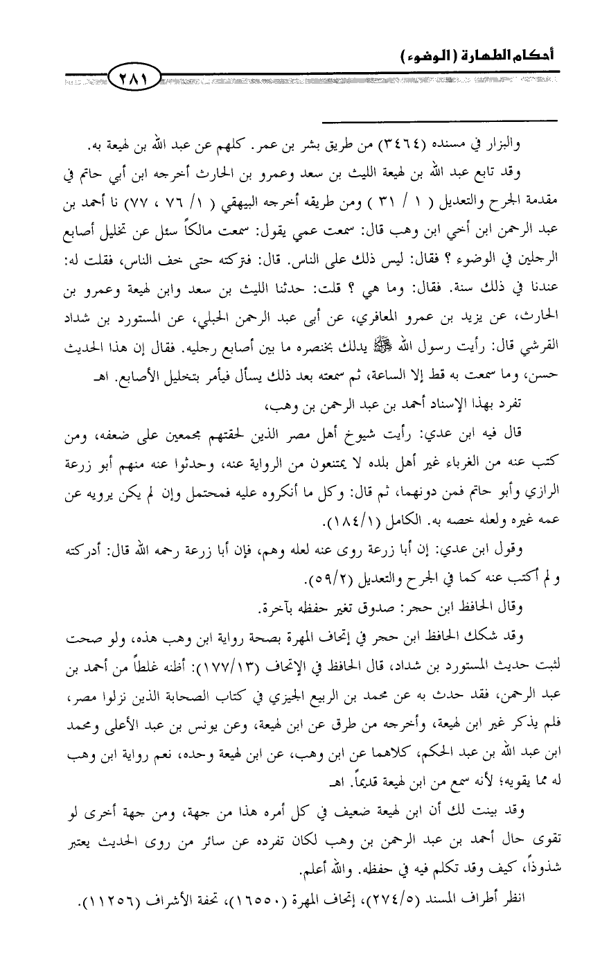 وقد تابع عبد الله بن لهيعة الليث بن سعد وعمرو بن الحارث أخرجه ابن أبي حاتم في مقدمة الجرح والتعديل (١/ ٣١) ومن طريقه أخرجه البيهقي (١/ ٧٦، ٧٧) نا أحمد بن عبد الرحمن ابن أخي ابن وهب قال: سمعت عمي يقول: سمعت مالكاً سئل عن تخليل أصابع الرجلين في الوضوء؟ فقال: ليس ذلك على الناس. قال: فتركته حتى خف الناس، فقلت له: عندنا في ذلك سنة. فقال: وما هي؟ قلت: حدثنا الليث بن سعد وابن لهيعة وعمرو بن الحارث، عن يزيد بن عمرو المعافري، عن أبى عبد الرحمن الحبلي، عن المستورد بن شداد القرشي قال: رأيت رسول الله - صلى الله عليه وسلم - يدلك بخنصره ما بين أصابع رجليه. فقال إن هذا الحديث حسن، وما سمعت به قط إلا الساعة، ثم سمعته بعد ذلك يسأل فيأمر بتخليل الأصابع. اهـ