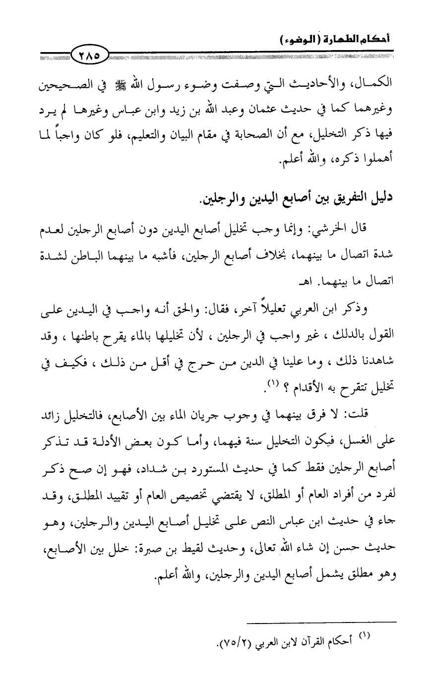 وذكر ابن العربي تعليلاً آخر، فقال: والحق أنه واجب في اليدين على القول بالدلك , غير واجب في الرجلين , لأن تخليلها بالماء يقرح باطنها , وقد شاهدنا ذلك , وما علينا في الدين من حرج في أقل من ذلك , فكيف في تخليل تتقرح به الأقدام؟ (¬١).