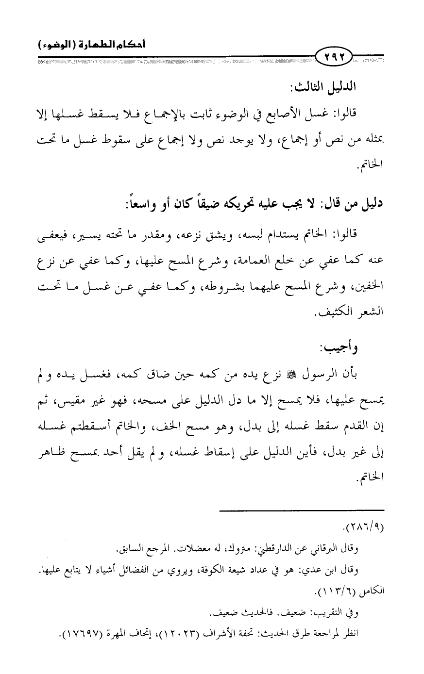 قالوا: غسل الأصابع في الوضوء ثابت بالإجماع فلا يسقط غسلها إلا بمثله من نص أو إجماع، ولا يوجد نص ولا إجماع على سقوط غسل ما تحت الخاتم.