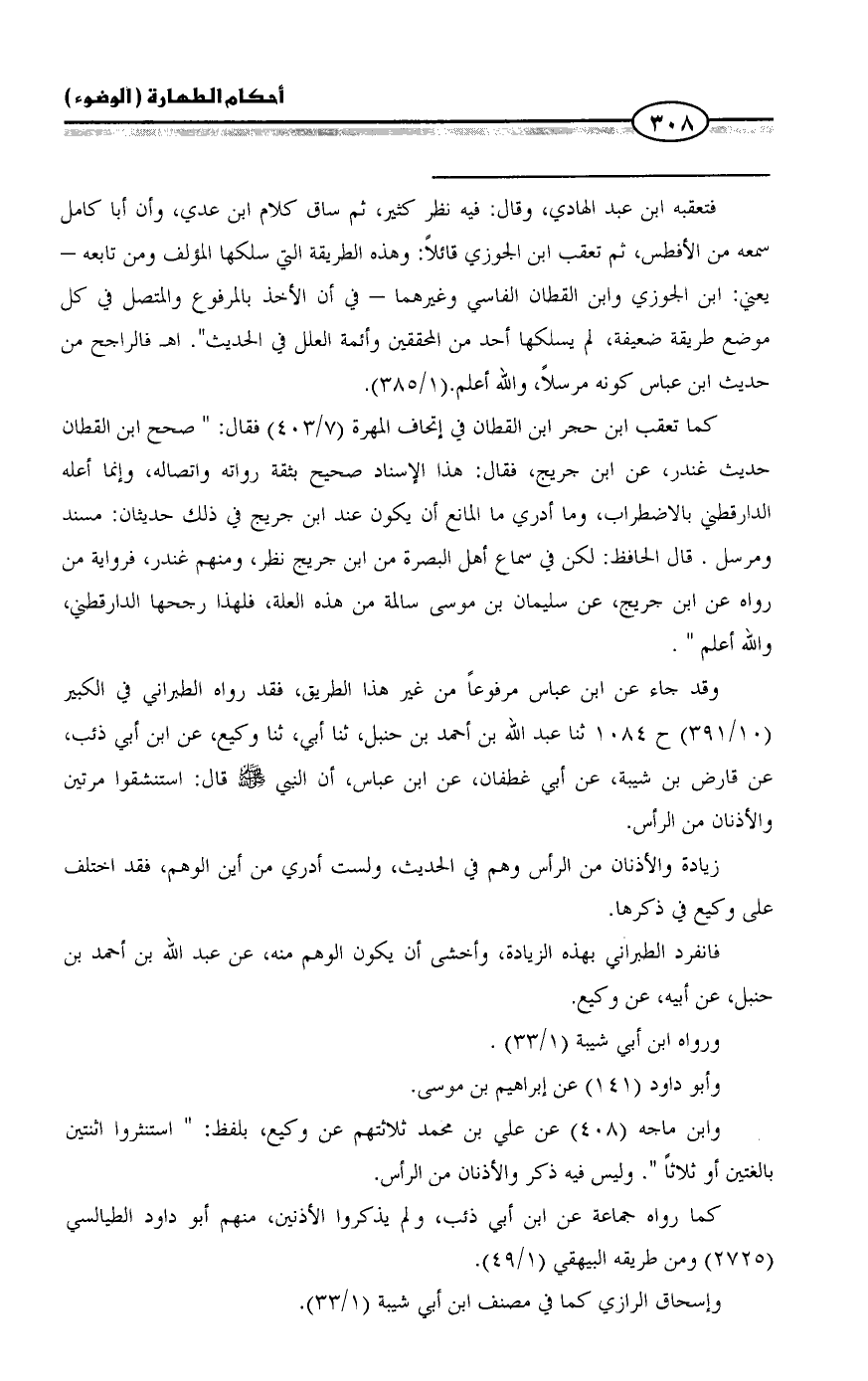 = فتعقبه ابن عبد الهادي، وقال: فيه نظر كثير، ثم ساق كلام ابن عدي، وأن أبا كامل سمعه من الأفطس، ثم تعقب ابن الجوزي قائلاً: وهذه الطريقة التي سلكها المؤلف ومن تابعه - يعني: ابن الجوزي وابن القطان الفاسي وغيرهما - في أن الأخذ بالمرفوع والمتصل في كل موضع طريقة ضعيفة، لم يسلكها أحد من المحققين وأئمة العلل في الحديث". اهـ فالراجح من حديث ابن عباس كونه مرسلاً، والله أعلم. (١/ ٣٨٥).