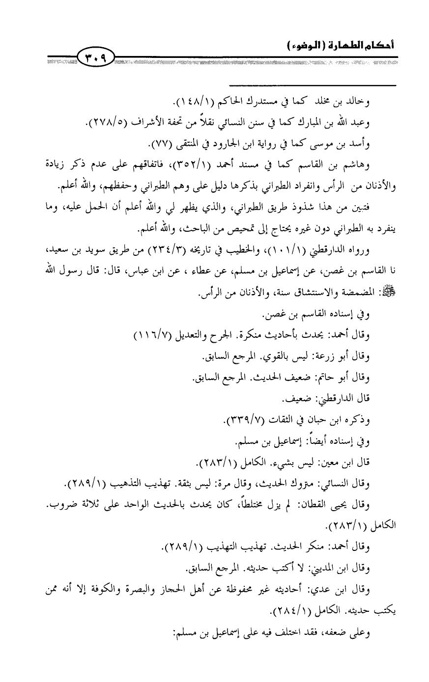 وهاشم بن القاسم كما في مسند أحمد (١/ ٣٥٢)، فاتفاقهم على عدم ذكر زيادة والأذنان من الرأس وانفراد الطبراني بذكرها دليل على وهم الطبراني وحفظهم، والله أعلم.