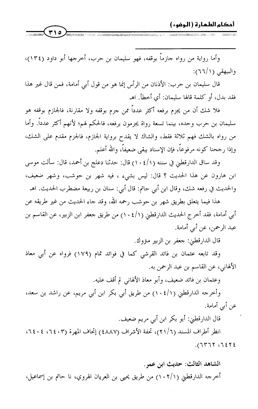 هذا فيما يتعلق بطريق شهر بن حوشب رحمه الله، وقد جاء الحديث من غير طريقه عن أبي أمامة، فقد أخرج الحديث الدارقطني (١/ ١٠٤) من طريق جعفر ابن الزبير، عن القاسم بن عبد الرحمن، عن أبي أمامة.