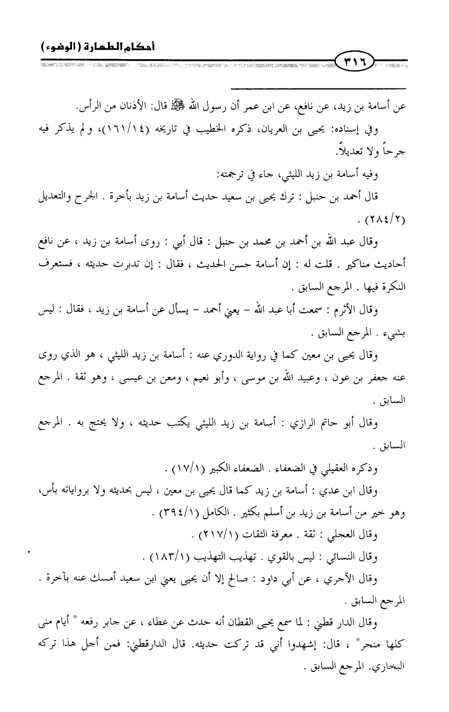 = عن أسامة بن زيد، عن نافع، عن ابن عمر أن رسول الله - صلى الله عليه وسلم - قال: الأذنان من الرأس.