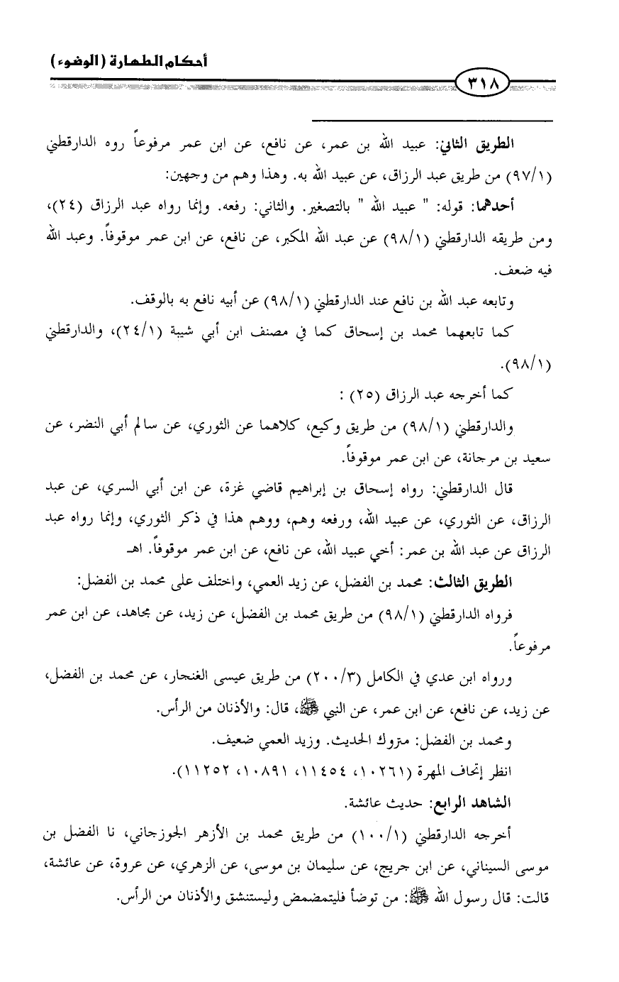 = الطريق الثاني: عبيد الله بن عمر، عن نافع، عن ابن عمر مرفوعاً روه الدارقطني (١/ ٩٧) من طريق عبد الرزاق، عن عبيد الله به. وهذا وهم من وجهين: