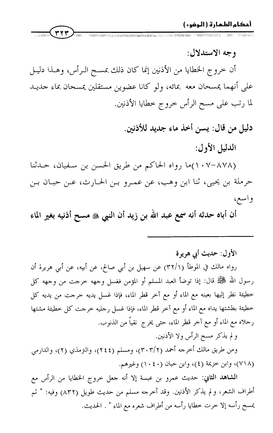 أن خروج الخطايا من الأذنين إنما كان ذلك بمسح الرأس، وهذا دليل على أنهما يمسحان معه بمائه، ولو كانا عضوين مستقلين يمسحان بماء جديد لما رتب على مسح الرأس خروج خطايا الأذنين.