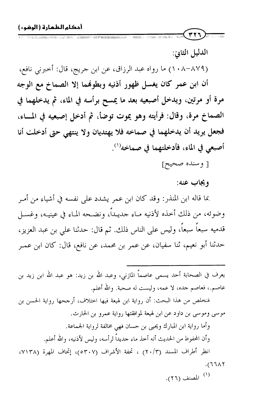 أن ابن عمر كان يغسل ظهور أذنيه وبطونهما إلا الصماخ مع الوجه مرة أو مرتين، ويدخل أصبعيه بعد ما يمسح برأسه في الماء، ثم يدخلهما في الصماخ مرة، وقال: فرأيته وهو يموت توضأ، ثم أدخل إصبعيه في الماء، فجعل يريد أن يدخلهما في صماخه فلا يهتديان ولا ينتهي حتى أدخلت أنا أصبعي في الماء، فأدخلتهما في صماخه (¬١).