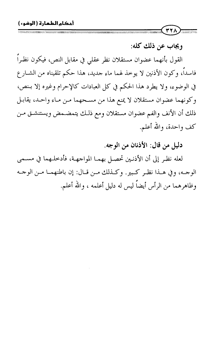 لعله نظر إلى أن الأذنين تحصل بهما المواجهة، فأدخلهما في مسمى الوجه، وفي هذا نظر كبير. وكذلك من قال: إن باطنهما من الوجه وظاهرهما من الرأس أيضاً ليس له دليل أعلمه، والله أعلم.