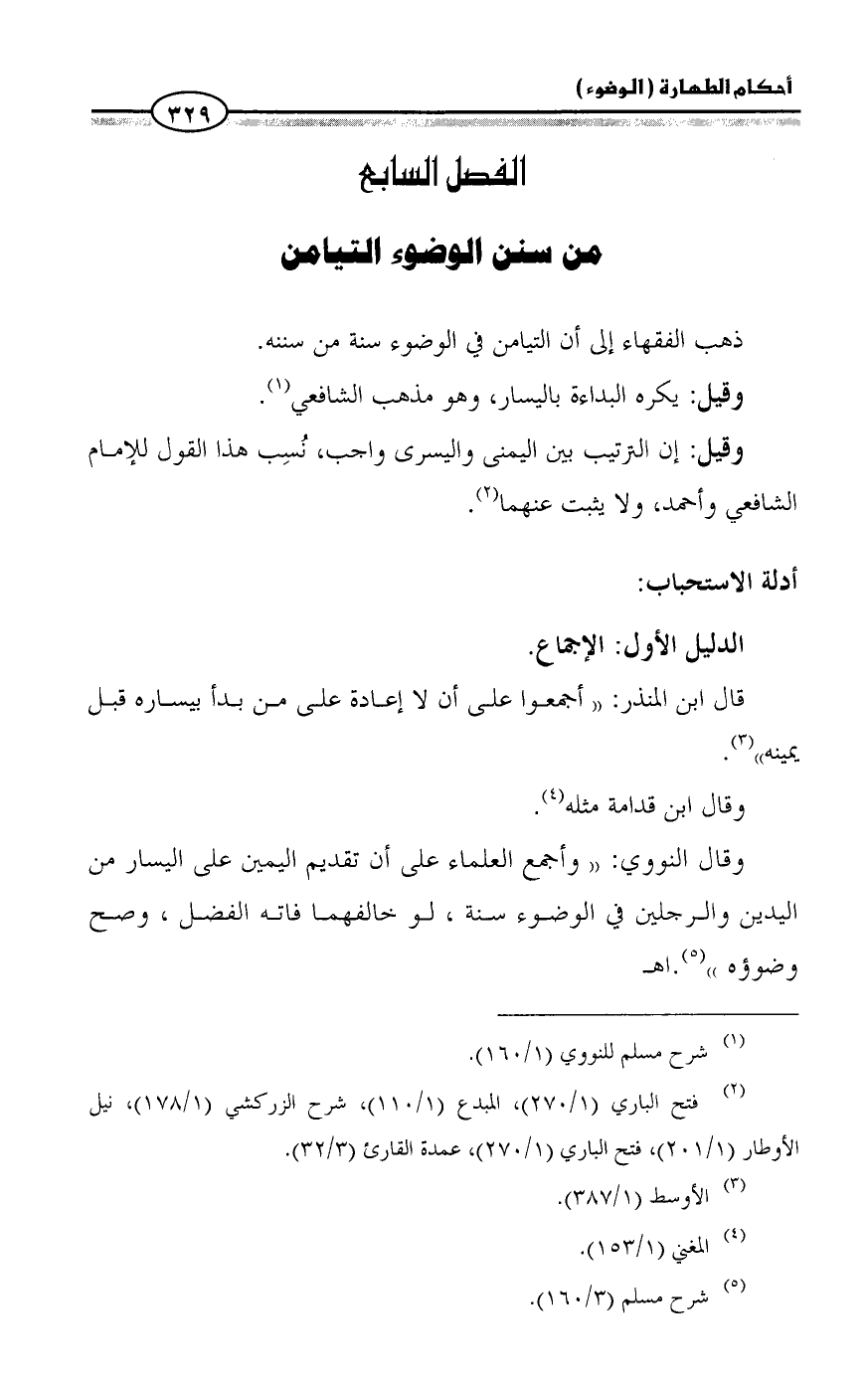 وقال النووي: «وأجمع العلماء على أن تقديم اليمين على اليسار من اليدين والرجلين في الوضوء سنة، لو خالفهما فاته الفضل، وصح وضوؤه» (¬٥). اهـ