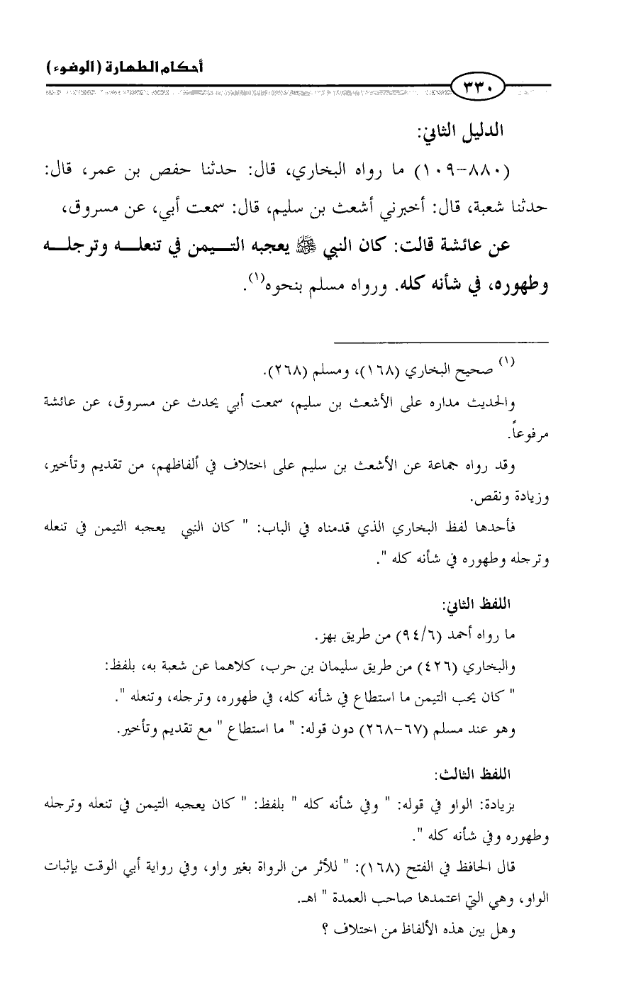 عن عائشة قالت: كان النبي - صلى الله عليه وسلم - يعجبه التيمن في تنعله وترجله وطهوره، في شأنه كله. ورواه مسلم بنحوه (¬١).