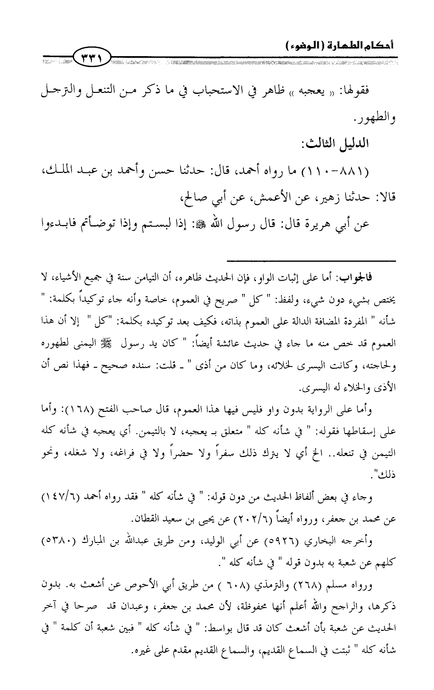 = فالجواب: أما على إثبات الواو، فإن الحديث ظاهره، أن التيامن سنة في جميع الأشياء، لا يختص بشيء دون شيء، ولفظ: " كل " صريح في العموم، خاصة وأنه جاء توكيداً بكلمة: " شأنه " المفردة المضافة الدالة على العموم بذاته، فكيف بعد توكيده بكلمة: "كل " إلا أن هذا العموم قد خص منه ما جاء في حديث عائشة أيضاً: " كان يد رسول - صلى الله عليه وسلم - اليمنى لطهوره ولحاجته، وكانت اليسرى لخلائه، وما كان من أذى " ـ قلت: سنده صحيح ـ فهذا نص أن الأذى والخلاء له اليسرى.