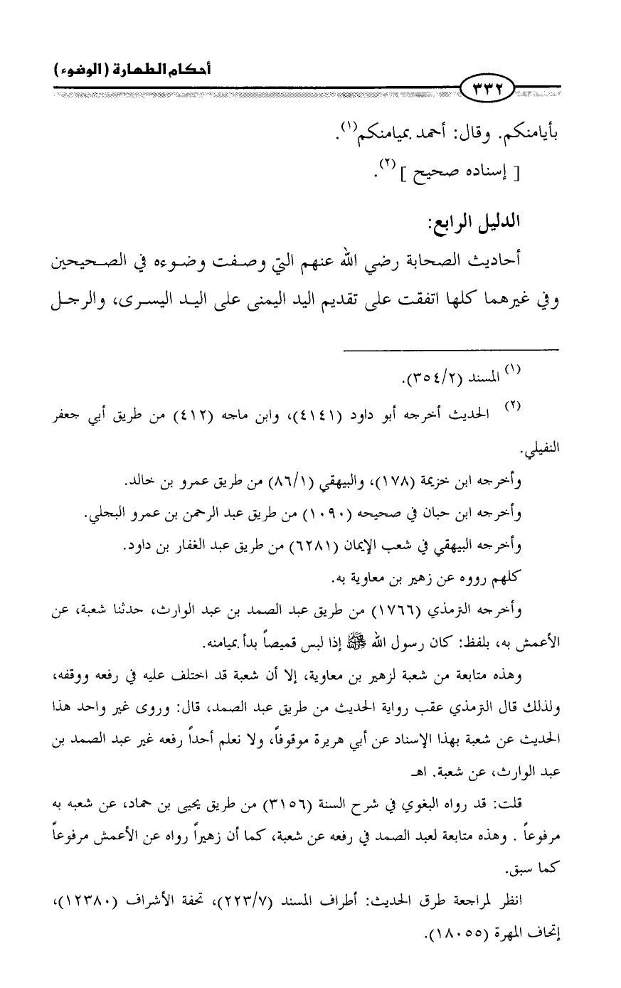 أحاديث الصحابة رضي الله عنهم التي وصفت وضوءه في الصحيحين وفي غيرهما كلها اتفقت على تقديم اليد اليمنى على اليد اليسرى، والرجل