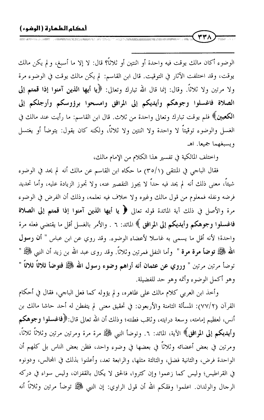 وأخذ ابن العربي كلام مالك على ظاهره، ولم يؤوله كما فعل الباجي، فقال في أحكام القرآن (٢/ ٧٧): المسألة الثامنة والأربعون: في تحقيق معنى لم يتفطن له أحد حاشا مالك بن أنس, لعظيم إمامته, وسعة درايته, وثاقب فطنته; وذلك أن الله تعالى قال: {فاغسلوا وجوهكم وأيديكم إلى المرافق} الآية، المائد: ٦. وتوضأ النبي - صلى الله عليه وسلم - مرة مرة ومرتين مرتين وثلاثاً ثلاثاً, ومرتين في بعض أعضائه وثلاثاً في بعضها في وضوء واحد, فظن بعض الناس بل كلهم أن الواحدة فرض, والثانية فضل, والثالثة مثلها, والرابعة تعد, وأعلنوا بذلك في المجالس, ودونوه في القراطيس; وليس كما زعموا وإن كثروا, فالحق لا يكال بالقفزان, وليس سواء في دركه الرجال والولدان. اعلموا وفقكم الله أن قول الراوي: إن النبي - صلى الله عليه وسلم - توضأ مرتين وثلاثاً أنه =