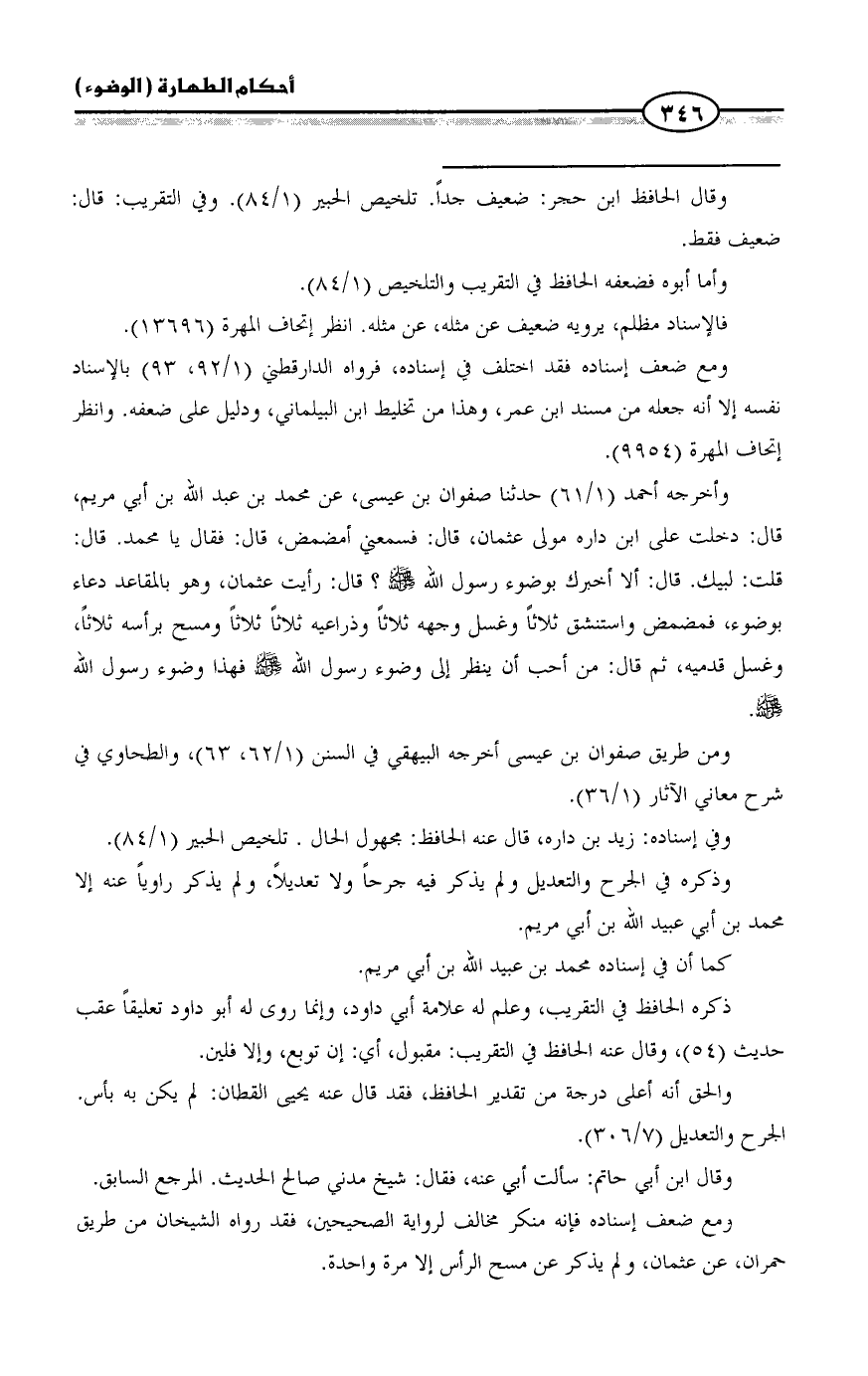 وأخرجه أحمد (١/ ٦١) حدثنا صفوان بن عيسى، عن محمد بن عبد الله بن أبي مريم، قال: دخلت على ابن داره مولى عثمان، قال: فسمعني أمضمض، قال: فقال يا محمد. قال: قلت: لبيك. قال: ألا أخبرك بوضوء رسول الله - صلى الله عليه وسلم -؟ قال: رأيت عثمان، وهو بالمقاعد دعاء بوضوء، فمضمض واستنشق ثلاثاً وغسل وجهه ثلاثاً وذراعيه ثلاثاً ثلاثاً ومسح برأسه ثلاثاً، وغسل قدميه، ثم قال: من أحب أن ينظر إلى وضوء رسول الله - صلى الله عليه وسلم - فهذا وضوء رسول الله - صلى الله عليه وسلم -.