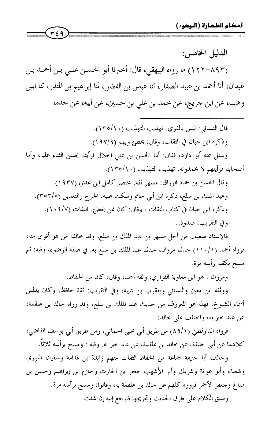 وخالف أبا حنيفة جماعة من الحفاظ الثقات منهم زائدة بن قدامة وسفيان الثوري وشعبة، وأبو عوانة وشريك وأبو الأِشهب جعفر بن الحارث وحازم بن إبراهيم وحسن بن صالح وجعفر الأحمر فرووه كلهم عن خالد بن علقمة به، وقالوا: ومسح برأسه مرة.
