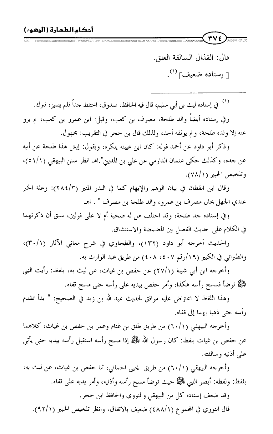 وأخرجه البيهقي (١/ ٦٠) من طريق يحيى الحماني، ثنا حفص بن غياث، عن ليث به، بلفظ: ولفظه: أبصر النبي - صلى الله عليه وسلم - حيث توضأ مسح رأسه وأذنيه، وأمر يديه على قفاه.