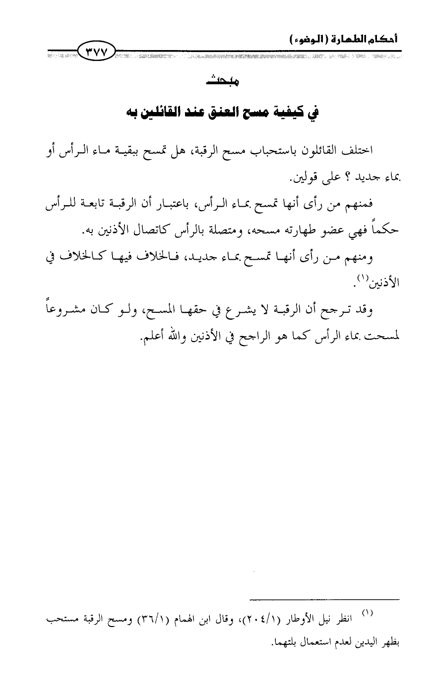 (¬١) انظر نيل الأوطار (١/ ٢٠٤)، وقال ابن الهمام (١/ ٣٦) ومسح الرقبة مستحب بظهر اليدين لعدم استعمال بلتهما.