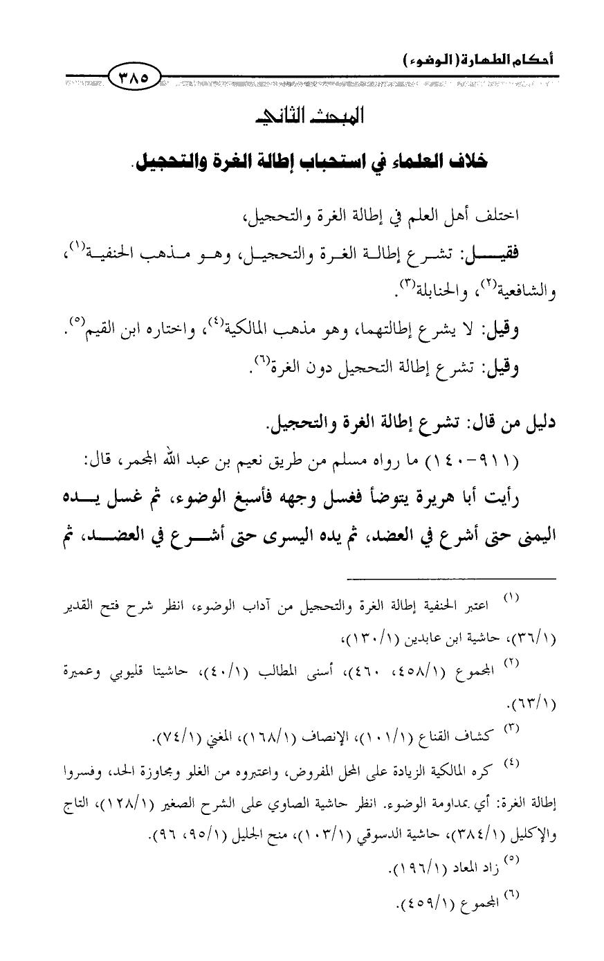 (¬١) اعتبر الحنفية إطالة الغرة والتحجيل من آداب الوضوء، انظر شرح فتح القدير (١/ ٣٦)، حاشية ابن عابدين (١/ ١٣٠)،