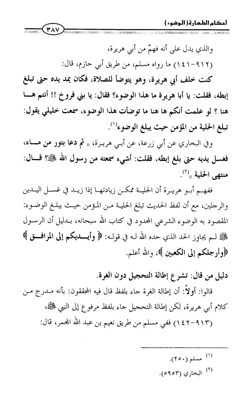 ففهم أبو هريرة أن الحلية ممكن زيادتها إذا زيد في غسل اليدين والرجلين، مع أن لفظ الحديث تبلغ الحلية من المؤمن حيث يبلغ الوضوء: المقصود به الوضوء الشرعي المحدود في كتاب الله سبحانه، بدليل أن الرسول - صلى الله عليه وسلم - لم يجاوز الحد الذي حده الله له في قوله: {وأيديكم إلى المرافق} {وأرجلكم إلى الكعبين}، والله أعلم.