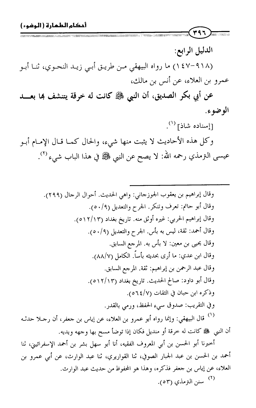 عن أبي بكر الصديق، أن النبي - صلى الله عليه وسلم - كانت له خرقة يتنشف بها بعد الوضوء.