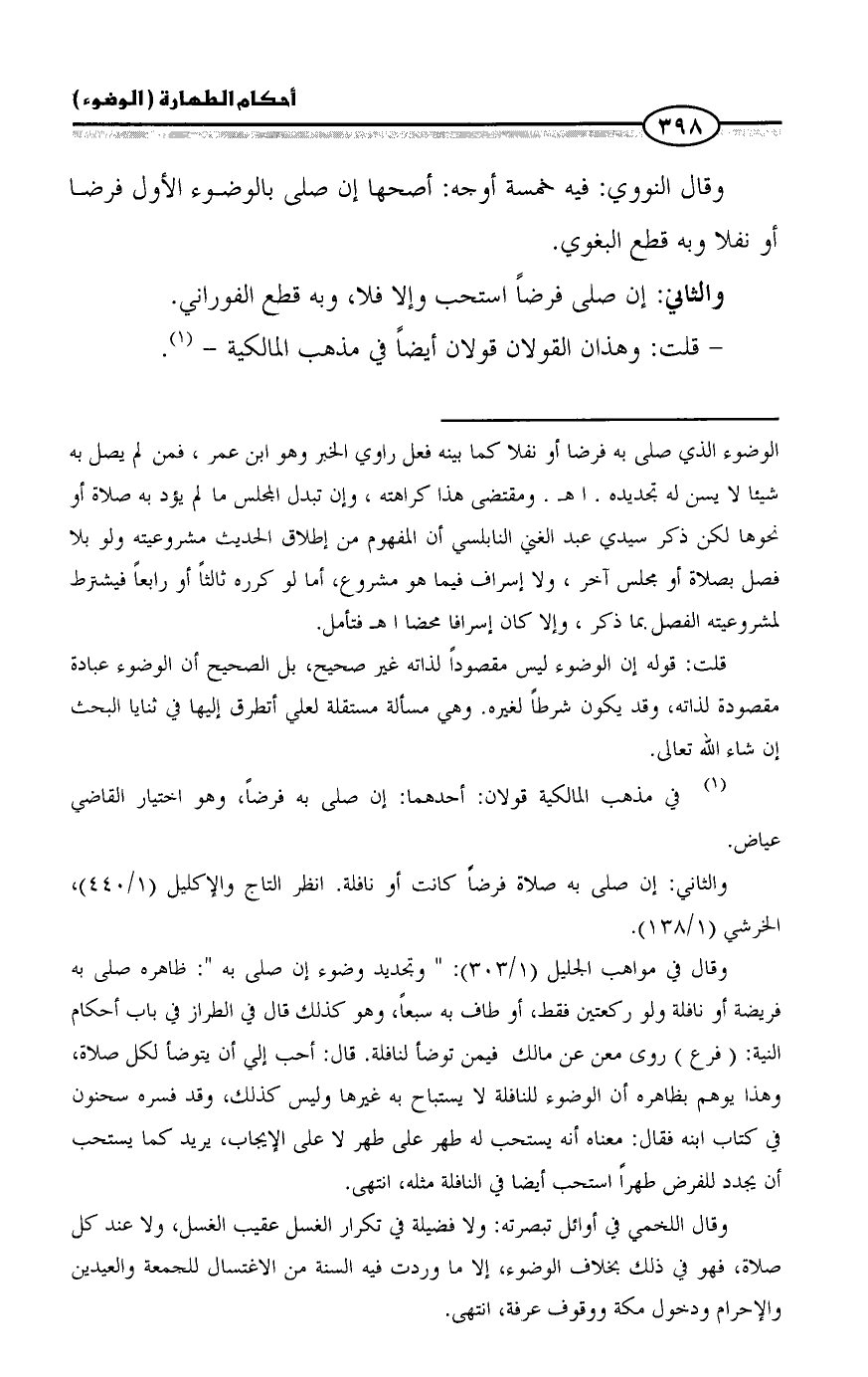وقال في مواهب الجليل (١/ ٣٠٣): " وتجديد وضوء إن صلى به ": ظاهره صلى به فريضة أو نافلة ولو ركعتين فقط، أو طاف به سبعاً، وهو كذلك قال في الطراز في باب أحكام النية: (فرع) روى معن عن مالك فيمن توضأ لنافلة. قال: أحب إلي أن يتوضأ لكل صلاة، وهذا يوهم بظاهره أن الوضوء للنافلة لا يستباح به غيرها وليس كذلك، وقد فسره سحنون في كتاب ابنه فقال: معناه أنه يستحب له طهر على طهر لا على الإيجاب، يريد كما يستحب أن يجدد للفرض طهراً استحب أيضا في النافلة مثله, انتهى.