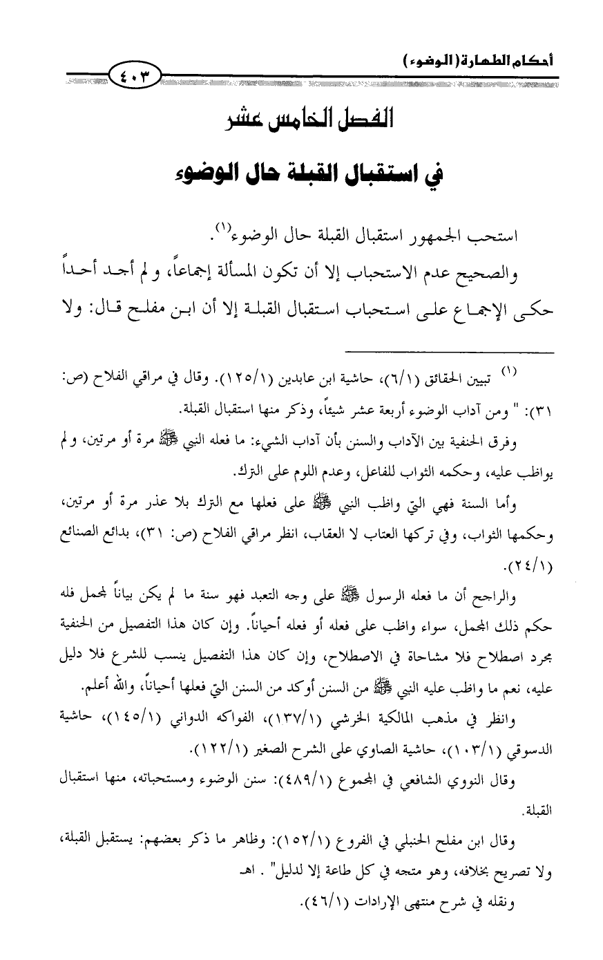 (¬١) تبيين الحقائق (١/ ٦)، حاشية ابن عابدين (١/ ١٢٥). وقال في مراقي الفلاح (ص: ٣١): " ومن آداب الوضوء أربعة عشر شيئاً، وذكر منها استقبال القبلة.