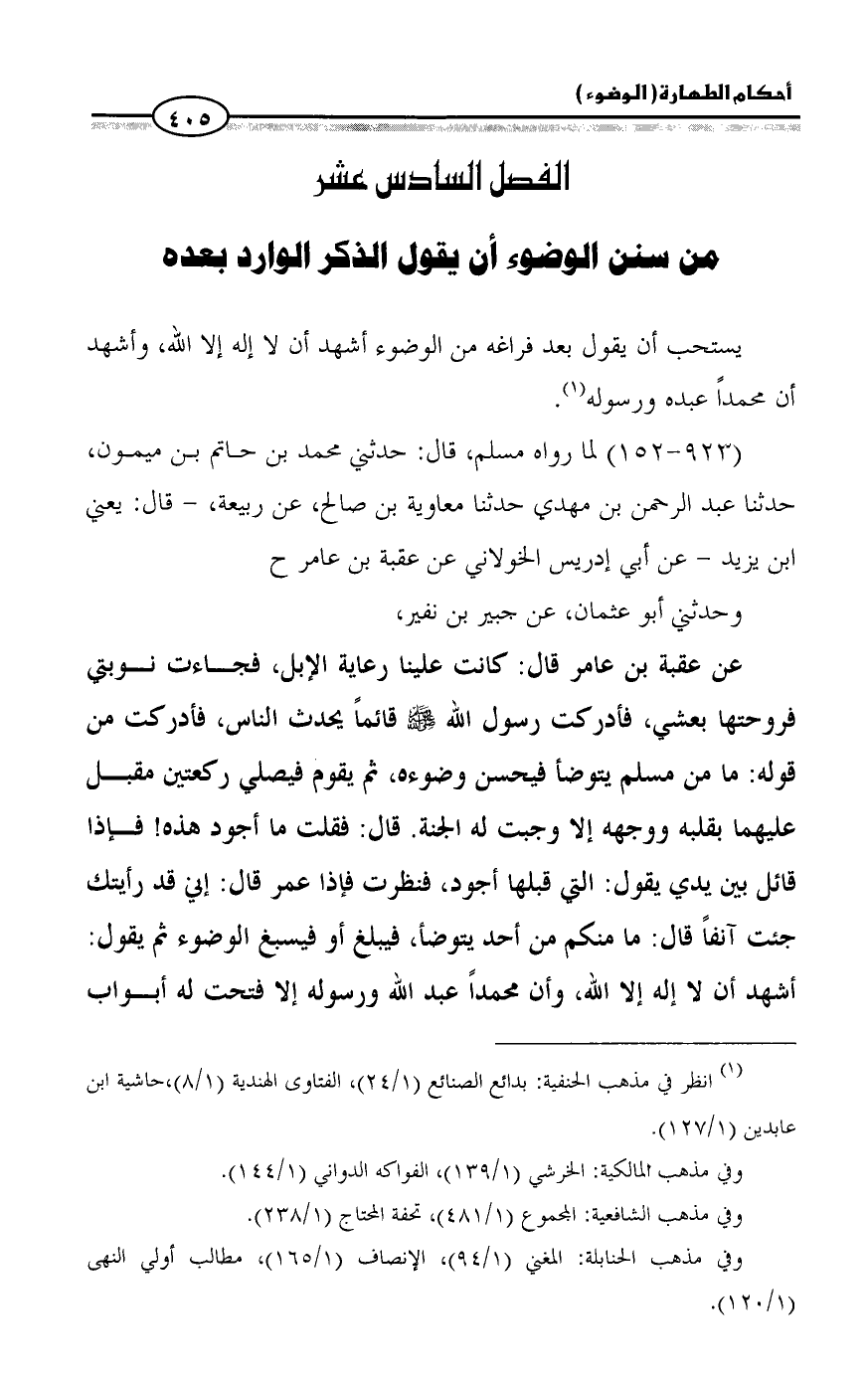(٩٢٣ - ١٥٢) لما رواه مسلم، قال: حدثني محمد بن حاتم بن ميمون، حدثنا عبد الرحمن بن مهدي حدثنا معاوية بن صالح، عن ربيعة، - قال: يعني ابن يزيد - عن أبي إدريس الخولاني عن عقبة بن عامر ح