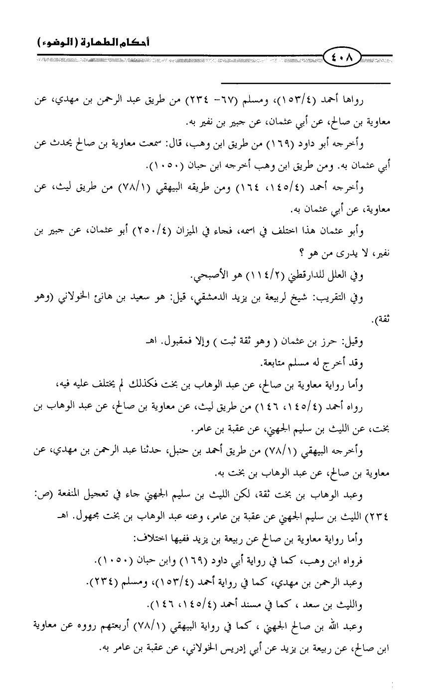وعبد الله بن صالح الجهني، كما في رواية البيهقي (١/ ٧٨) أربعتهم رووه عن معاوية ابن صالح، عن ربيعة بن يزيد عن أبي إدريس الخولاني، عن عقبة بن عامر به. =
