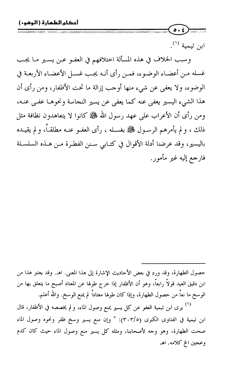 (¬1) يرى ابن تيمية العفو عن كل يسير يمنع وصول الماء، ولم يخصصه في الأظفار، قال ابن تيمية في الفتاوى الكبرى (5/ 303): " وإن منع يسير وسخ ظفر ونحوه وصول الماء صحت الطهارة، وهو وجه لأصحابنا، ومثله كل يسير منع وصول الماء حيث كان كدم وعجين الخ كلامه. اهـ