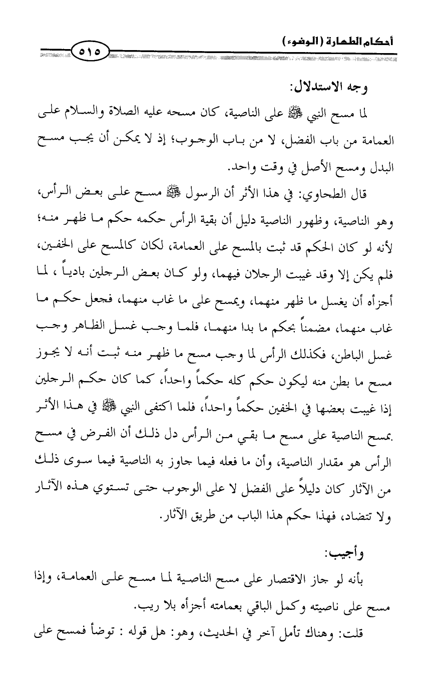 قال الطحاوي: في هذا الأثر أن الرسول - صلى الله عليه وسلم - مسح على بعض الرأس، وهو الناصية، وظهور الناصية دليل أن بقية الرأس حكمه حكم ما ظهر منه؛ لأنه لو كان الحكم قد ثبت بالمسح على العمامة، لكان كالمسح على الخفين، فلم يكن إلا وقد غيبت الرجلان فيهما، ولو كان بعض الرجلين بادياً، لما أجزأه أن يغسل ما ظهر منهما، ويمسح على ما غاب منهما، فجعل حكم ما غاب منهما، مضمناً بحكم ما بدا منهما، فلما وجب غسل الظاهر وجب غسل الباطن، فكذلك الرأس لما وجب مسح ما ظهر منه ثبت أنه لا يجوز مسح ما بطن منه ليكون حكم كله حكماً واحداً، كما كان حكم الرجلين إذا غيبت بعضها في الخفين حكماً واحداً، فلما اكتفى النبي - صلى الله عليه وسلم - في هذا الأثر بمسح الناصية على مسح ما بقي من الرأس دل ذلك أن الفرض في مسح الرأس هو مقدار الناصية، وأن ما فعله فيما جاوز به الناصية فيما سوى ذلك من الآثار كان دليلاً على الفضل لا على الوجوب حتى تستوي هذه الآثار ولا تتضاد، فهذا حكم هذا الباب من طريق الآثار.