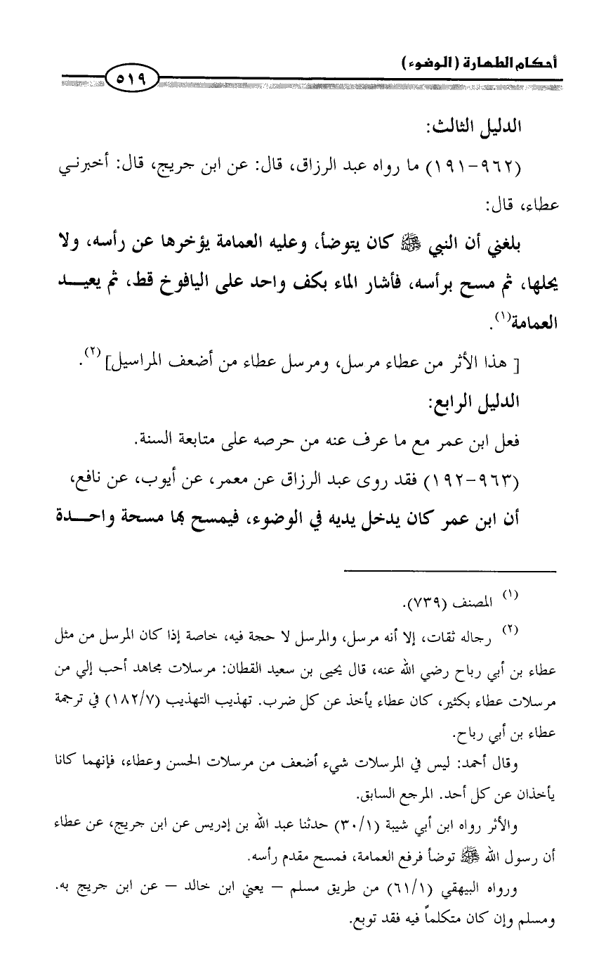 والأثر رواه ابن أبي شيبة (1/ 30) حدثنا عبد الله بن إدريس عن ابن جريج، عن عطاء أن رسول الله - صلى الله عليه وسلم - توضأ فرفع العمامة، فمسح مقدم رأسه.
