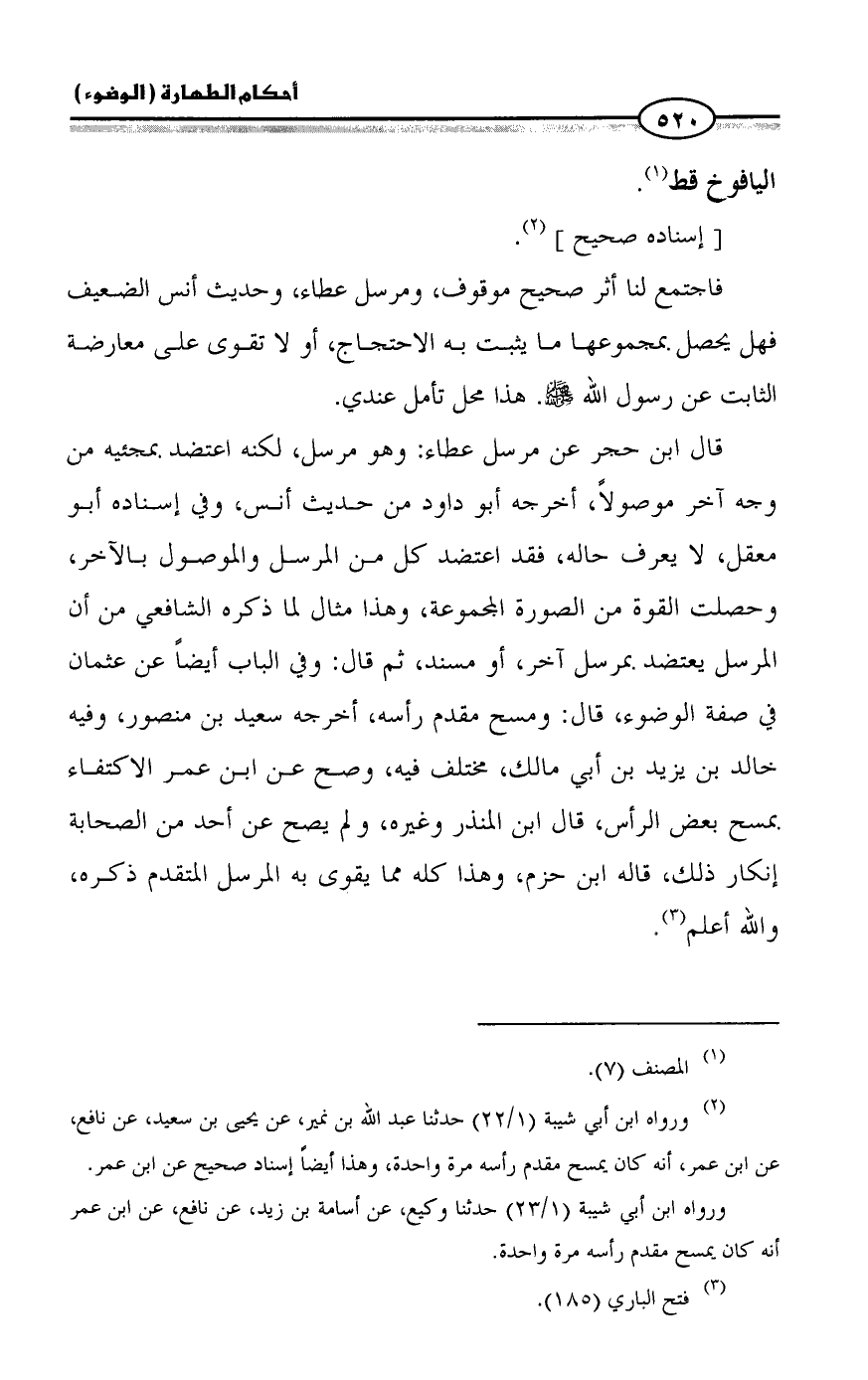 قال ابن حجر عن مرسل عطاء: وهو مرسل، لكنه اعتضد بمجئيه من وجه آخر موصولاً، أخرجه أبو داود من حديث أنس، وفي إسناده أبو معقل، لا يعرف حاله، فقد اعتضد كل من المرسل والموصول بالآخر، وحصلت القوة من الصورة المجموعة، وهذا مثال لما ذكره الشافعي من أن المرسل يعتضد بمرسل آخر، أو مسند، ثم قال: وفي الباب أيضاً عن عثمان في صفة الوضوء، قال: ومسح مقدم رأسه، أخرجه سعيد بن منصور، وفيه خالد بن يزيد بن أبي مالك، مختلف فيه، وصح عن ابن عمر الاكتفاء بمسح بعض الرأس، قال ابن المنذر وغيره، ولم يصح عن أحد من الصحابة إنكار ذلك، قاله ابن حزم، وهذا كله مما يقوى به المرسل المتقدم ذكره، والله أعلم (¬3).