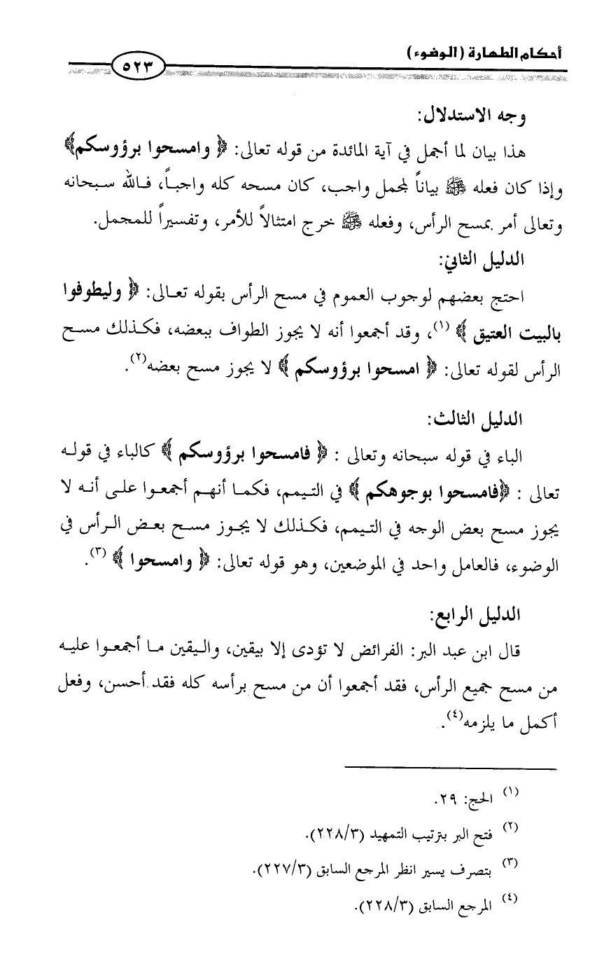 قال ابن عبد البر: الفرائض لا تؤدى إلا بيقين، واليقين ما أجمعوا عليه من مسح جميع الرأس، فقد أجمعوا أن من مسح برأسه كله فقد أحسن، وفعل أكمل ما يلزمه (¬4).