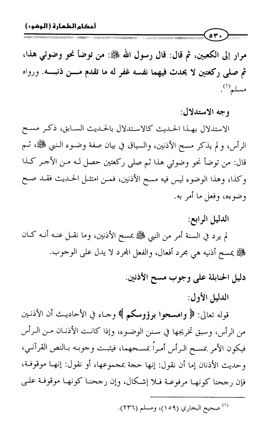 الاستدلال بهذا الحديث كالاستدلال بالحديث السابق، ذكر مسح الرأس، ولم يذكر مسح الأذنين، والسياق في بيان صفة وضوء النبي - صلى الله عليه وسلم -، ثم قال: من توضأ نحو وضوئي هذا ثم صلى ركعتين حصل له من الأجر كذا وكذا، وهذا الوضوء ليس فيه مسح الأذنين، فمن امتثل الحديث فقد صح وضوءه، وفعل ما أمر به.