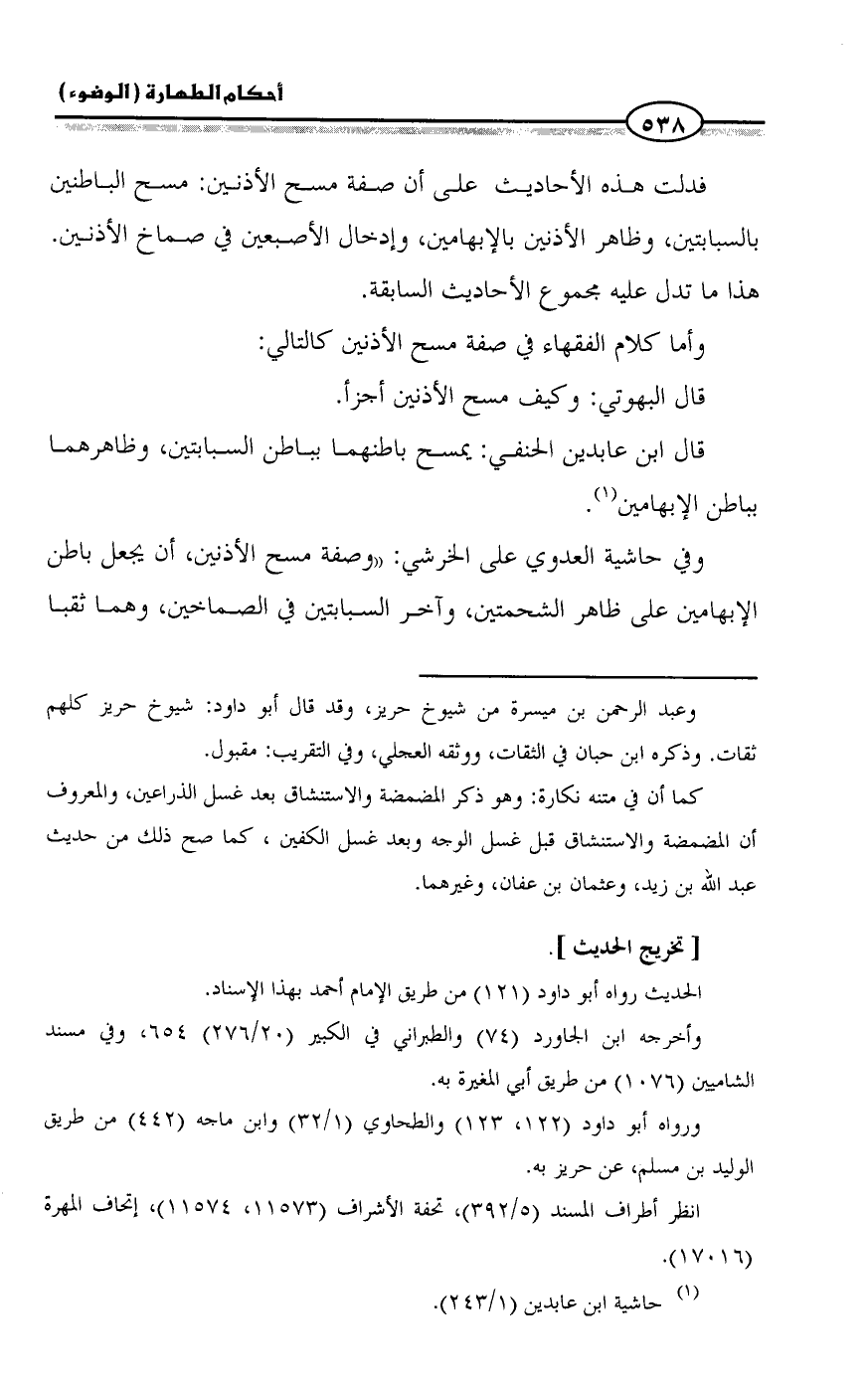 وفي حاشية العدوي على الخرشي: ((وصفة مسح الأذنين، أن يجعل باطن الإبهامين على ظاهر الشحمتين، وآخر السبابتين في الصماخين، وهما ثقبا