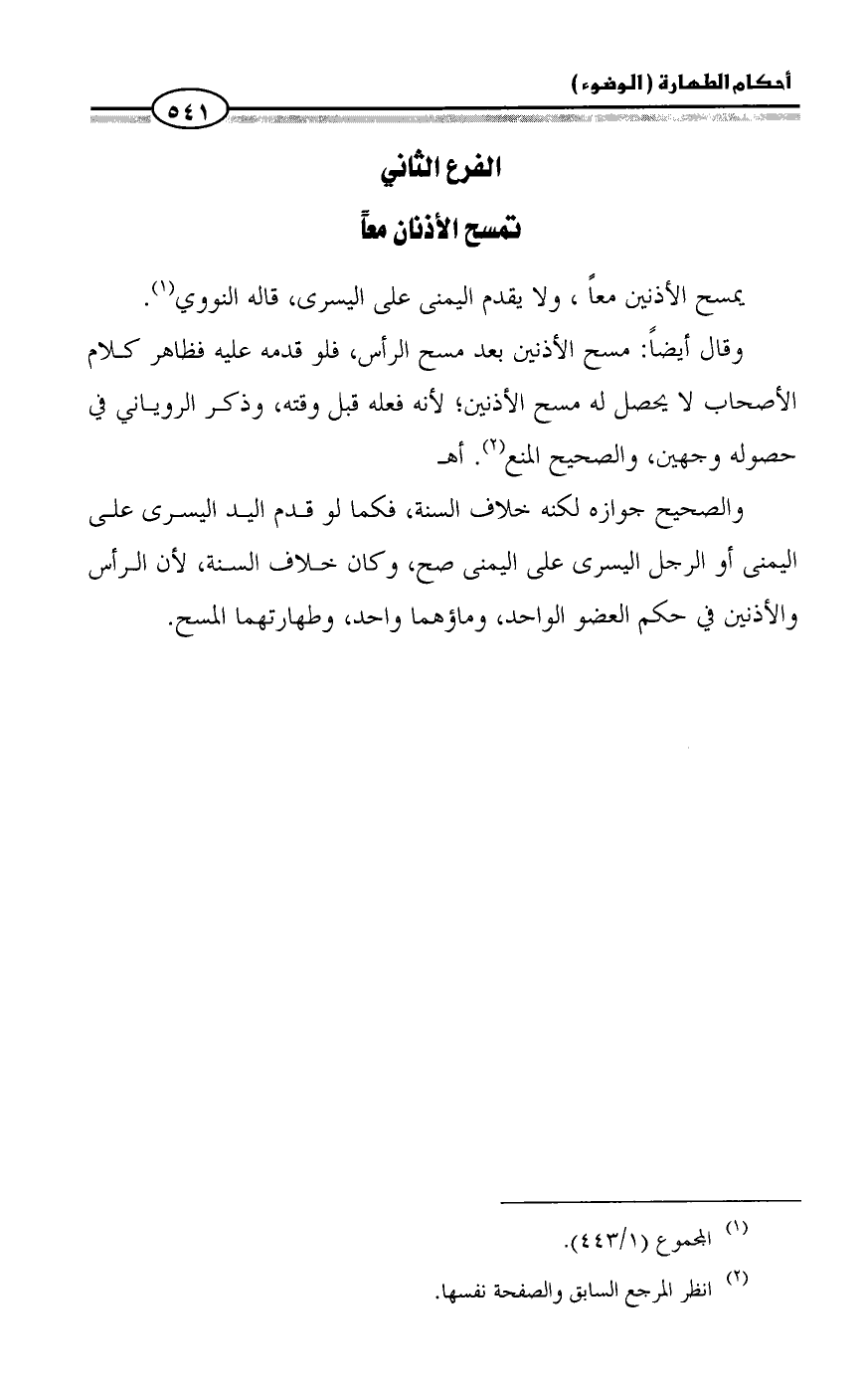 وقال أيضاً: مسح الأذنين بعد مسح الرأس، فلو قدمه عليه فظاهر كلام الأصحاب لا يحصل له مسح الأذنين؛ لأنه فعله قبل وقته، وذكر الروياني في حصوله وجهين، والصحيح المنع (¬2). أهـ
