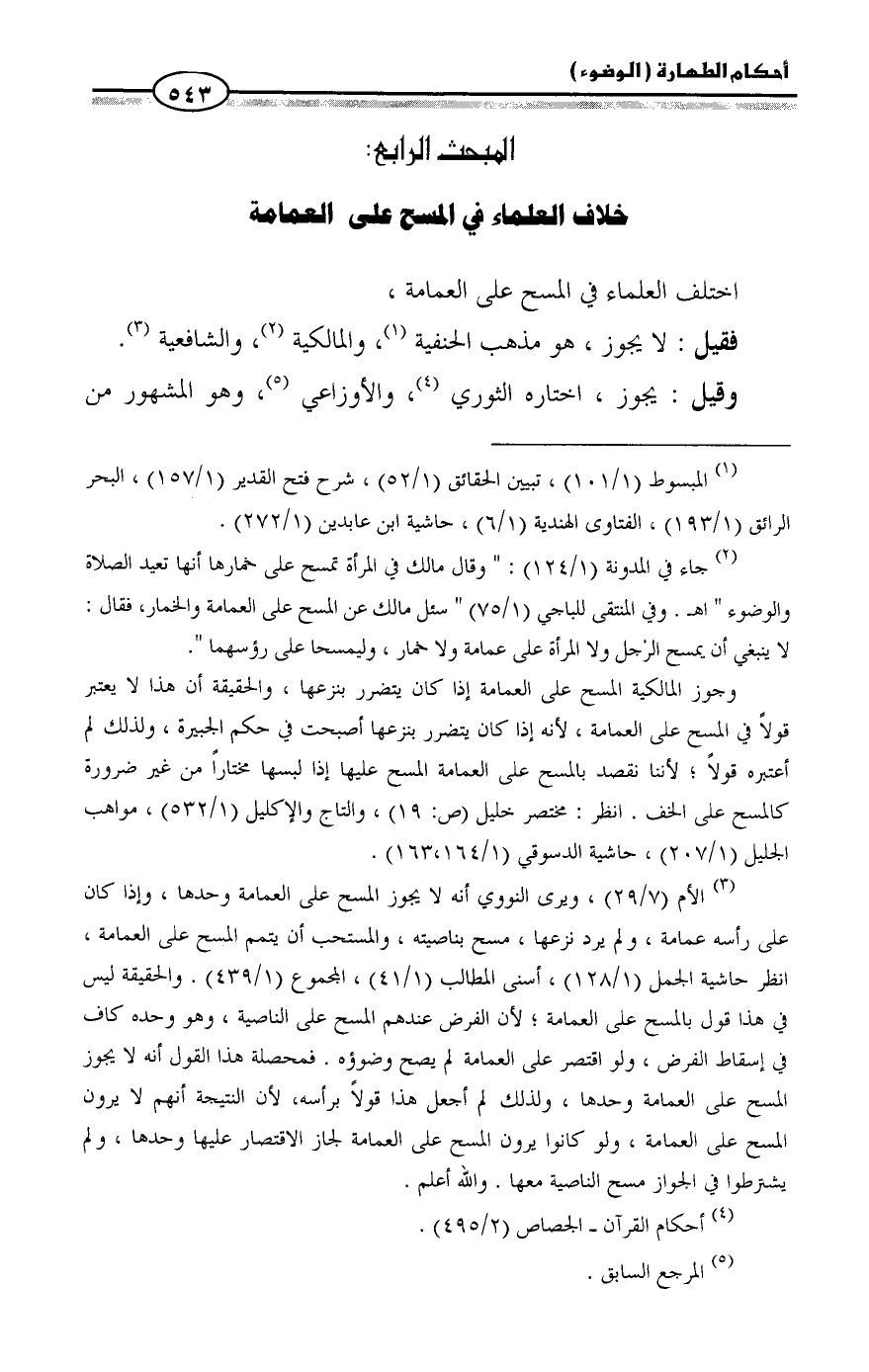 (¬3) الأم (7/ 29)، ويرى النووي أنه لا يجوز المسح على العمامة وحدها، وإذا كان على رأسه عمامة، ولم يرد نزعها، مسح بناصيته، والمستحب أن يتمم المسح على العمامة، انظر حاشية الجمل (1/ 128)، أسنى المطالب (1/ 41)، المجموع (1/ 439). والحقيقة ليس في هذا قول بالمسح على العمامة؛ لأن الفرض عندهم المسح على الناصية، وهو وحده كاف في إسقاط الفرض، ولو اقتصر على العمامة لم يصح وضوؤه. فمحصلة هذا القول أنه لا يجوز المسح على العمامة وحدها، ولذلك لم أجعل هذا قولاً برأسه، لأن النتيجة أنهم لا يرون المسح على العمامة، ولو كانوا يرون المسح على العمامة لجاز الاقتصار عليها وحدها، ولم يشترطوا في الجواز مسح الناصية معها. والله أعلم.