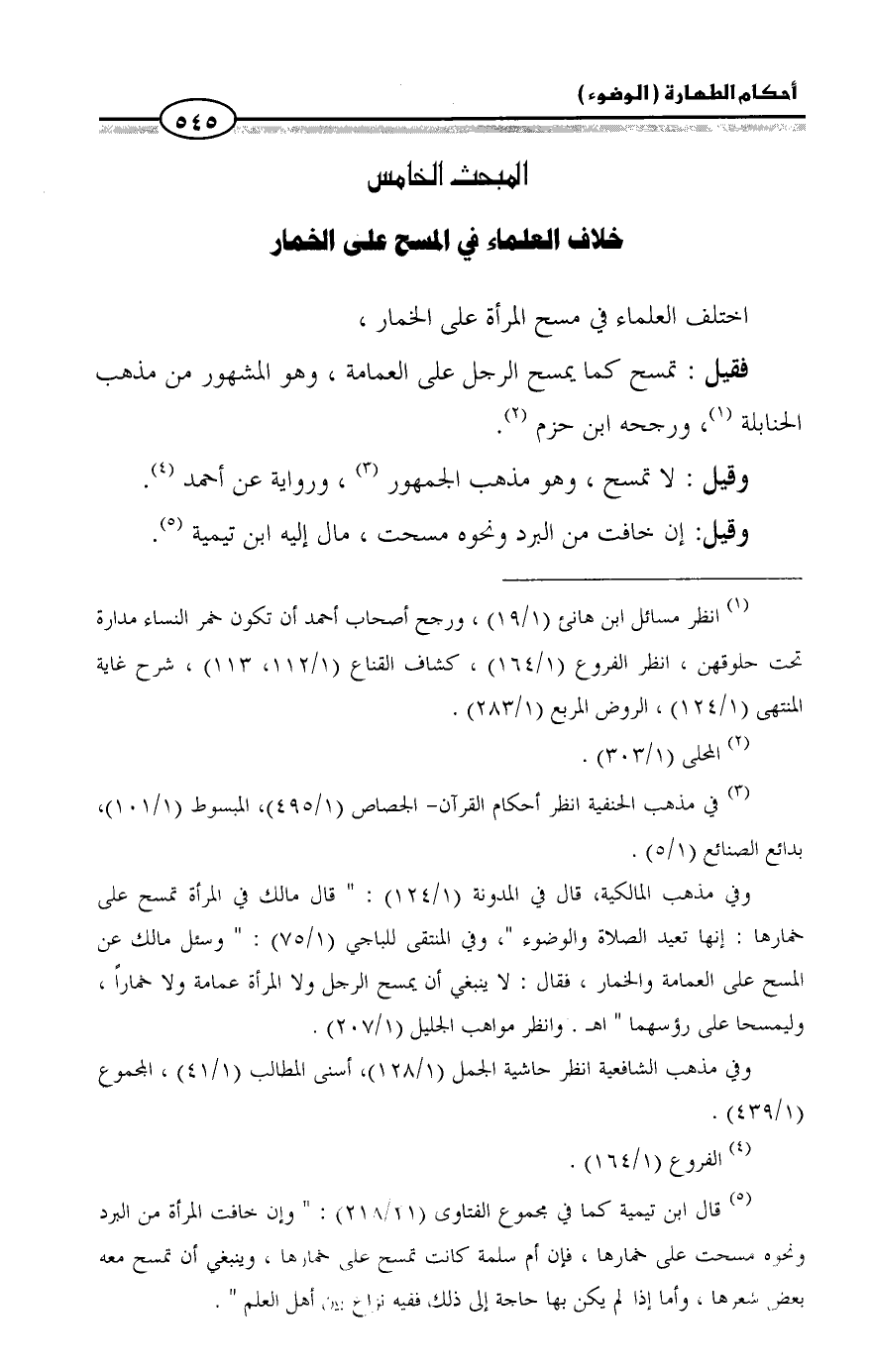 (¬5) قال ابن تيمية كما في مجموع الفتاوى (21/ 218): " وإن خافت المرأة من البرد ونحوه مسحت على خمارها، فإن أم سلمة كانت تمسح على خمارها، وينبغي أن تمسح معه بعض شعرها، وأما إذا لم يكن بها حاجة إلى ذلك ففيه نزاع بين أهل العلم ". =