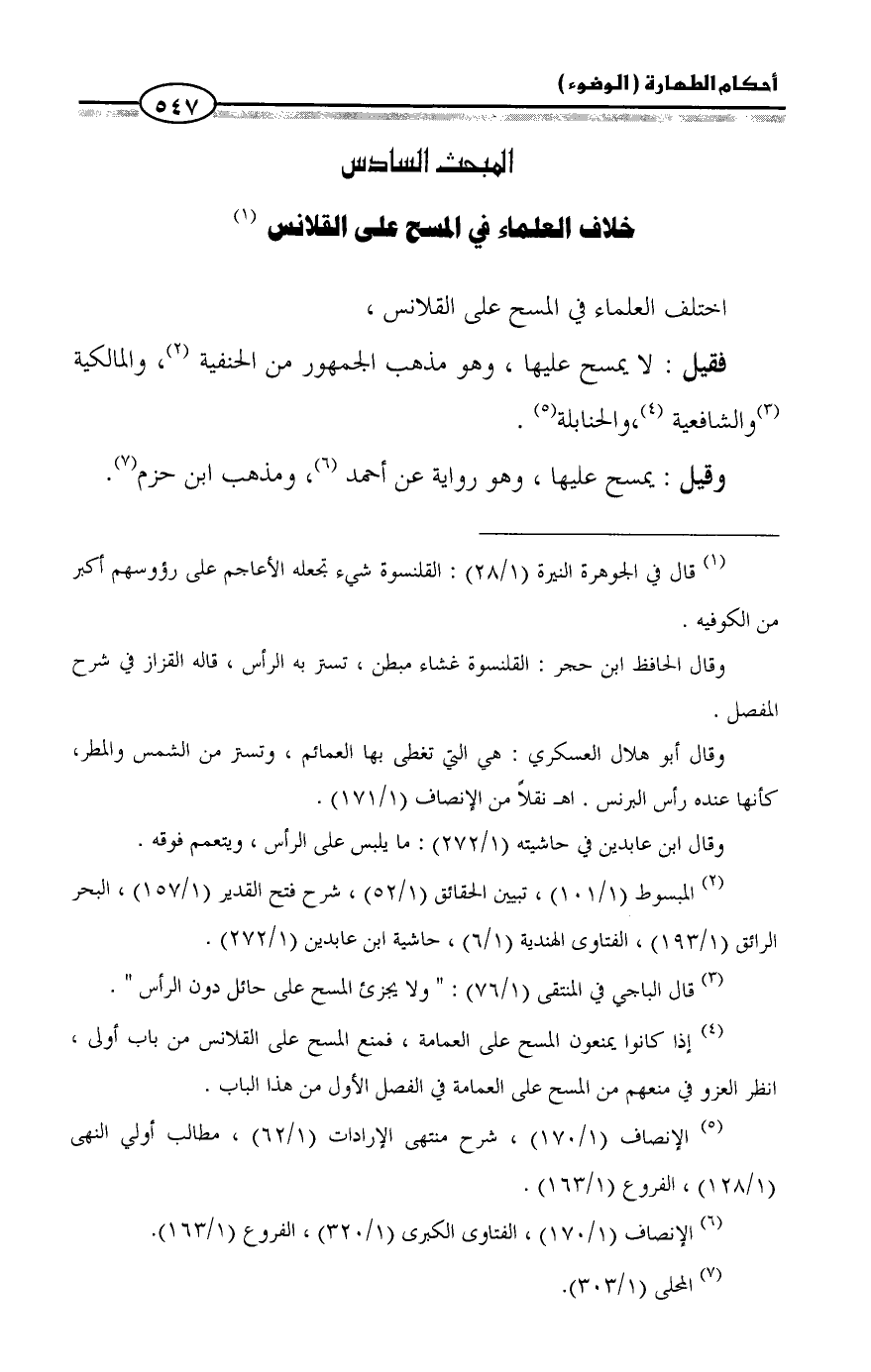 (¬4) إذا كانوا يمنعون المسح على العمامة، فمنع المسح على القلانس من باب أولى، انظر العزو في منعهم من المسح على العمامة في الفصل الأول من هذا الباب.