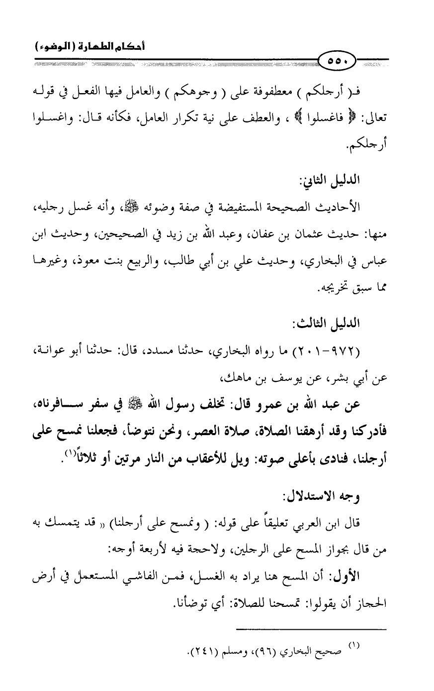 عن عبد الله بن عمرو قال: تخلف رسول الله - صلى الله عليه وسلم - في سفر سافرناه، فأدركنا وقد أرهقنا الصلاة، صلاة العصر، ونحن نتوضأ، فجعلنا نمسح على أرجلنا، فنادى بأعلى صوته: ويل للأعقاب من النار مرتين أو ثلاثاً (¬1).