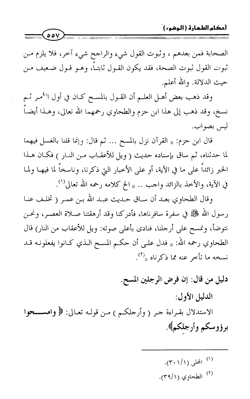 وقال الطحاوي بعد أن ساق حديث عبد الله بن عمر (تخلف عنا رسول الله - صلى الله عليه وسلم - في سفرة سافرناها، فأدركنا وقد أرهقتنا صلاة العصر، ونحن نتوضأ، ونمسح على أرجلنا، فنادى بأعلى صوته: ويل للأعقاب من النار) قال الطحاوي رحمه الله: «فدل على أن حكم المسح الذي كانوا يفعلونه قد نسخه ما تأخر عنه مما ذكرناه» (¬2).
