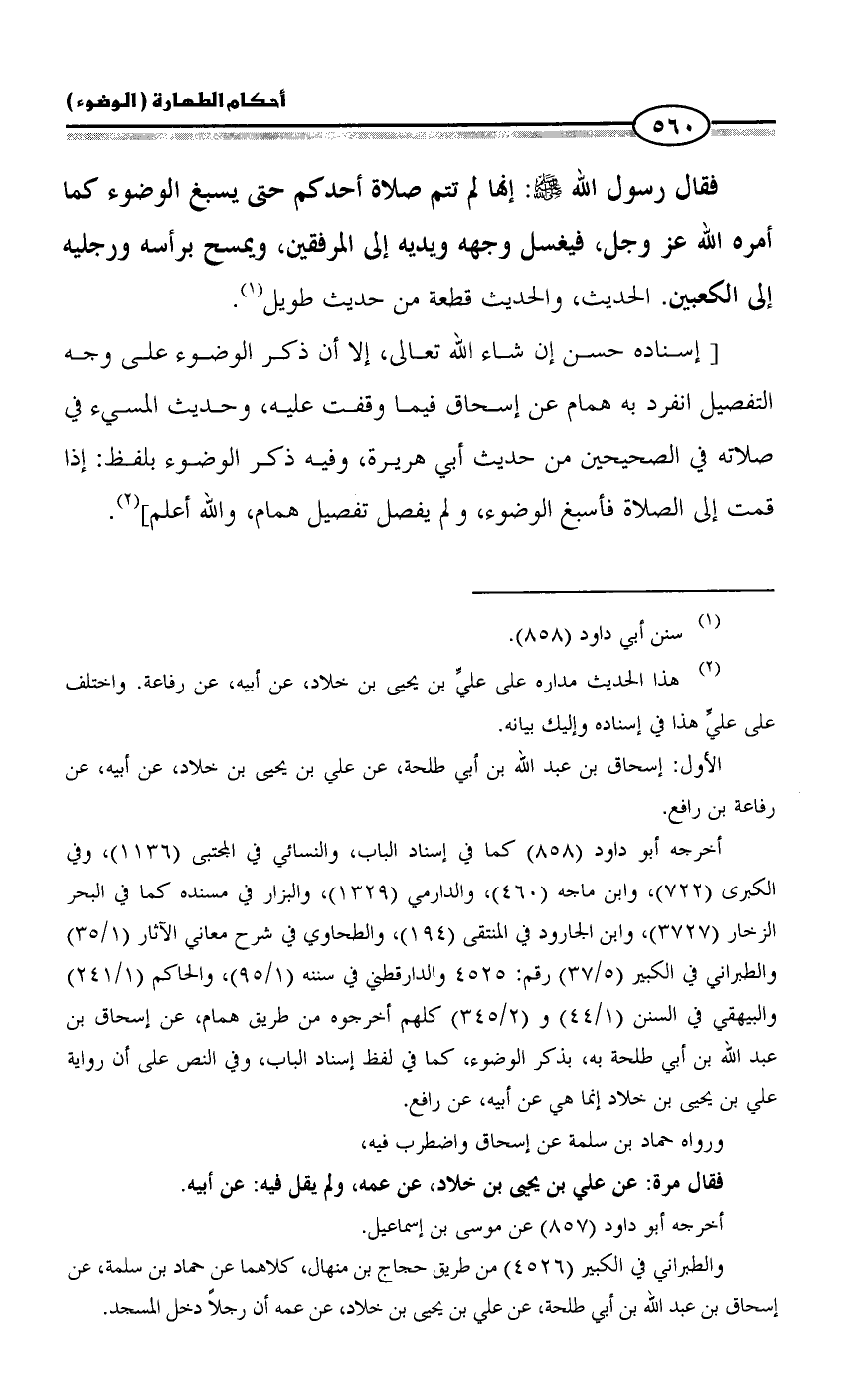 [إسناده حسن إن شاء الله تعالى، إلا أن ذكر الوضوء على وجه التفصيل انفرد به همام عن إسحاق فيما وقفت عليه، وحديث المسيء في صلاته في الصحيحين من حديث أبي هريرة، وفيه ذكر الوضوء بلفظ: إذا قمت إلى الصلاة فأسبغ الوضوء، ولم يفصل تفصيل همام، والله أعلم] (¬2).